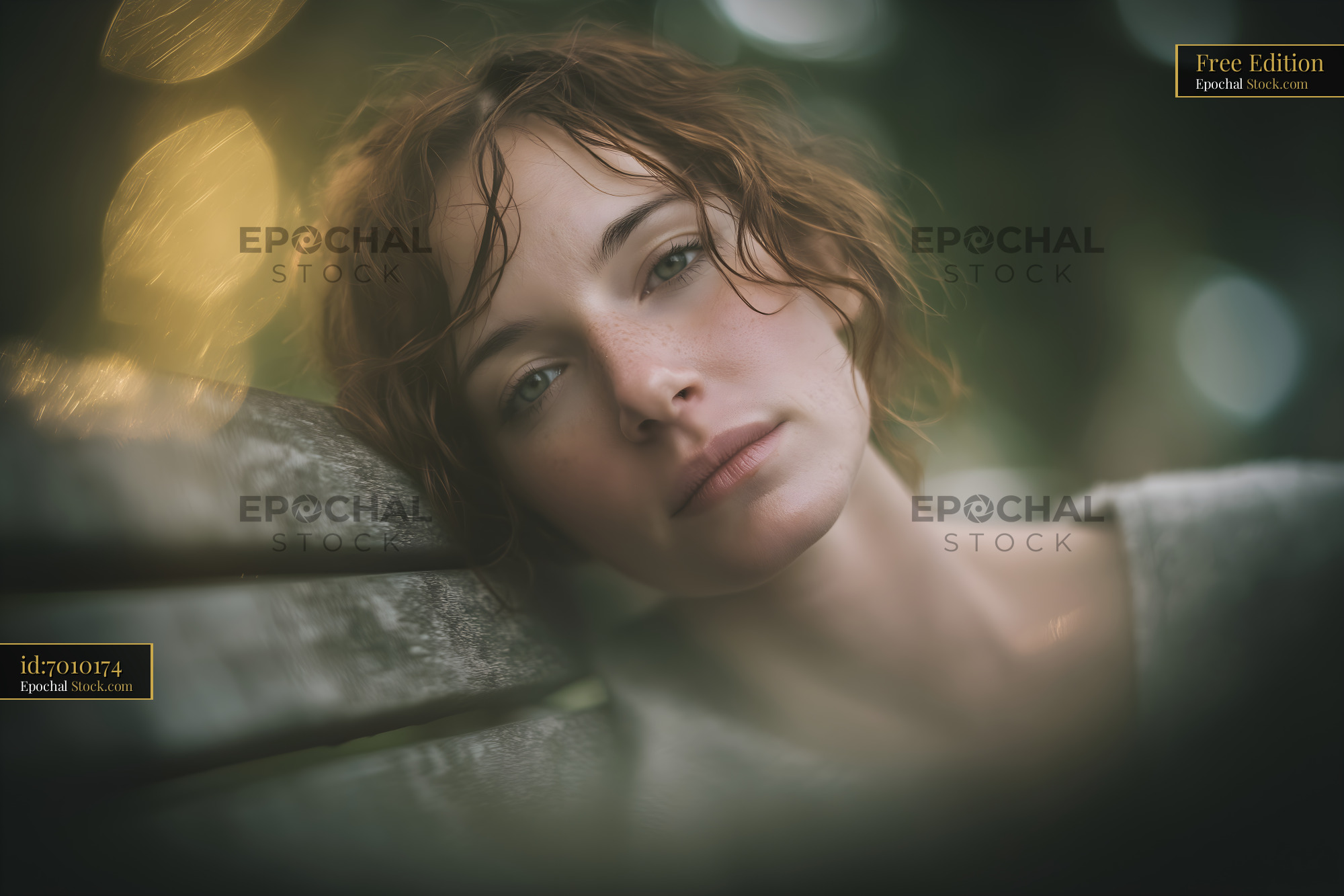 A woman with curly hair sits on a bench. She leans slightly to one side, looking thoughtful as soft evening light surrounds her. The scene has a calm atmosphere with blurred lights in the background.
