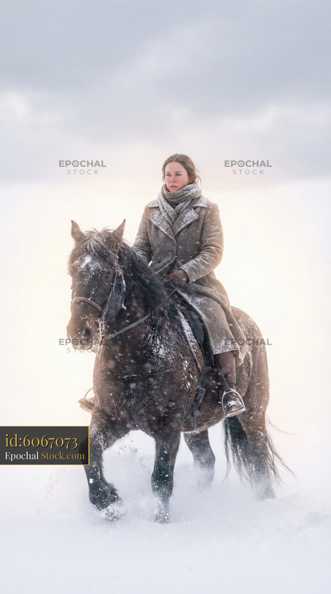 A woman sits on a horse as they move through a snowy field. Snow falls around them while the sun creates a bright glow in the background. It shows winter scenery and the bond between rider and horse.