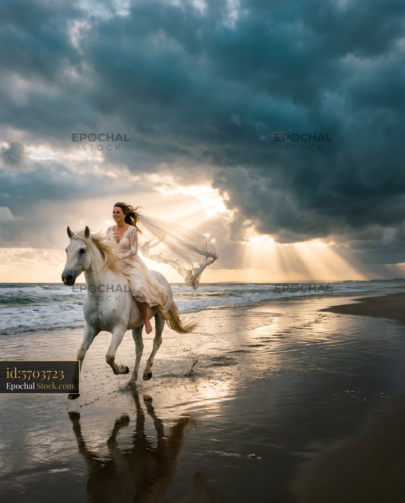 A woman rides a white horse along the beach as waves crash at sunset. Dark clouds gather above while sunlight breaks through, creating a dramatic scene. The horse gallops over wet sand.