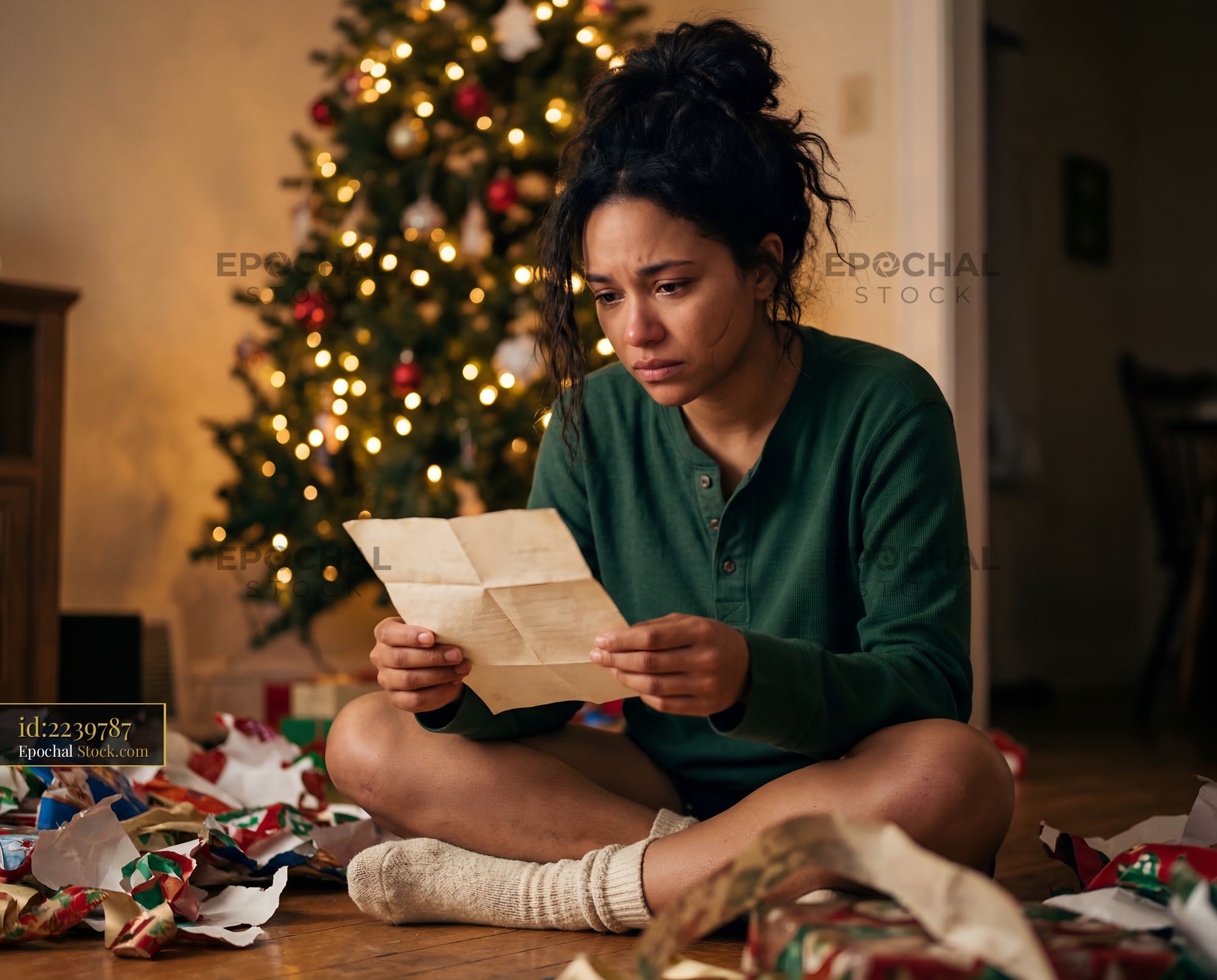 A woman sits on the floor with wrapping paper around her. She holds a letter while looking at it with a serious expression. A Christmas tree is lit in the background.