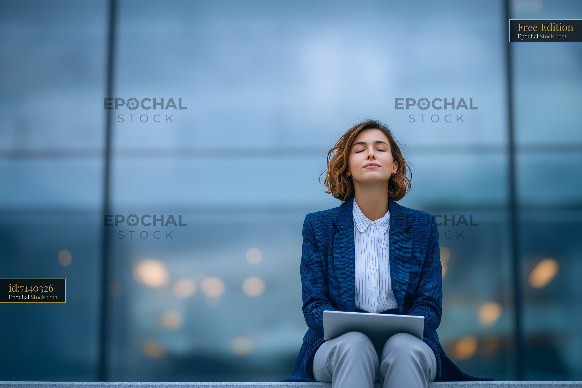 A woman sits on a ledge in an urban setting. She closes her eyes and takes a moment to relax while holding a laptop. The background shows a modern building with glass.
