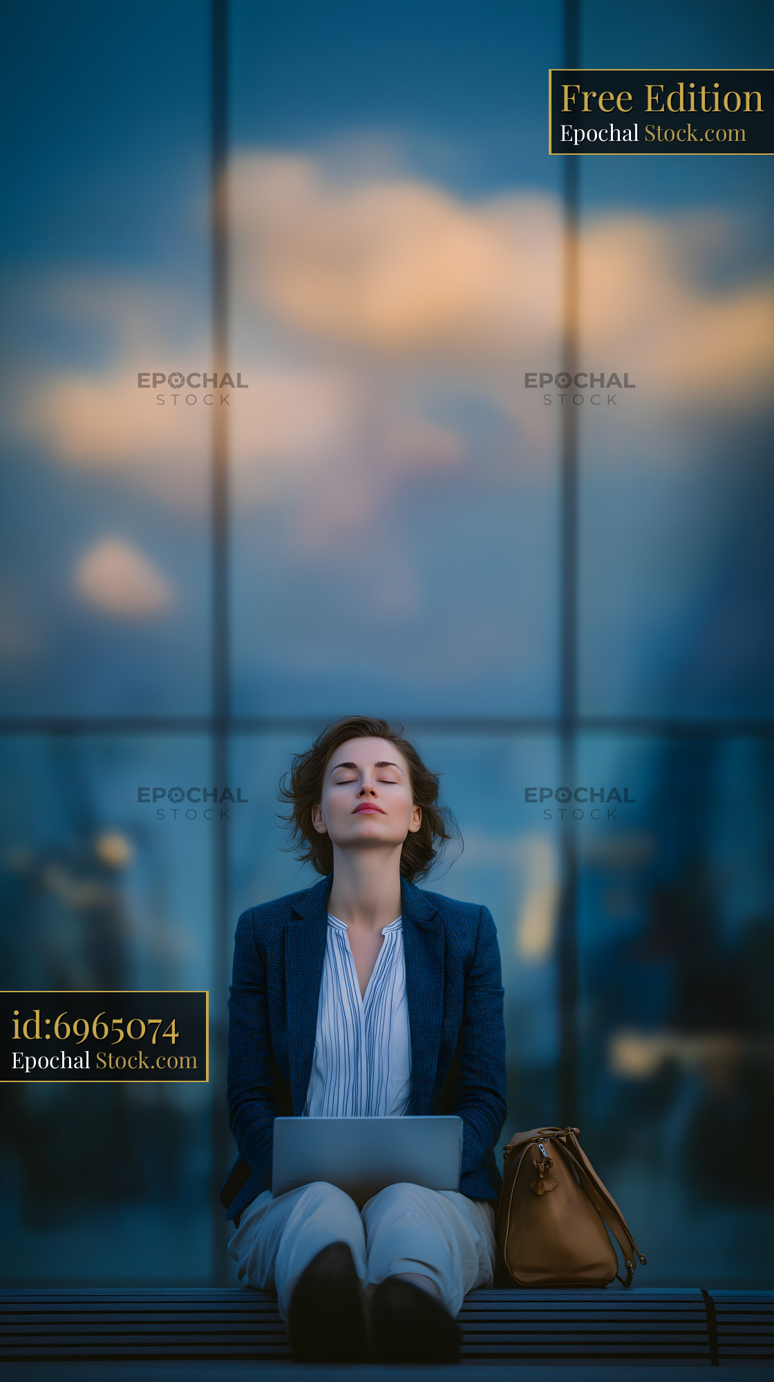 A woman sits on a bench with her laptop in front of her. She closes her eyes and enjoys the sunlight. The setting shows buildings in the background and a blue sky.