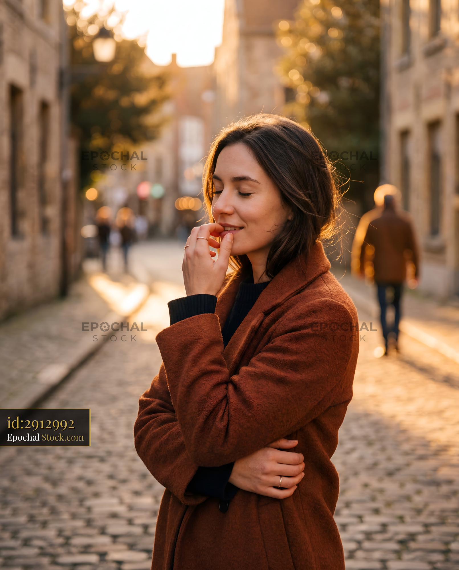 A woman stands on a cobblestone street smiling gently while the sun sets. People walk in the background, and warm light fills the scene creating a relaxed atmosphere.