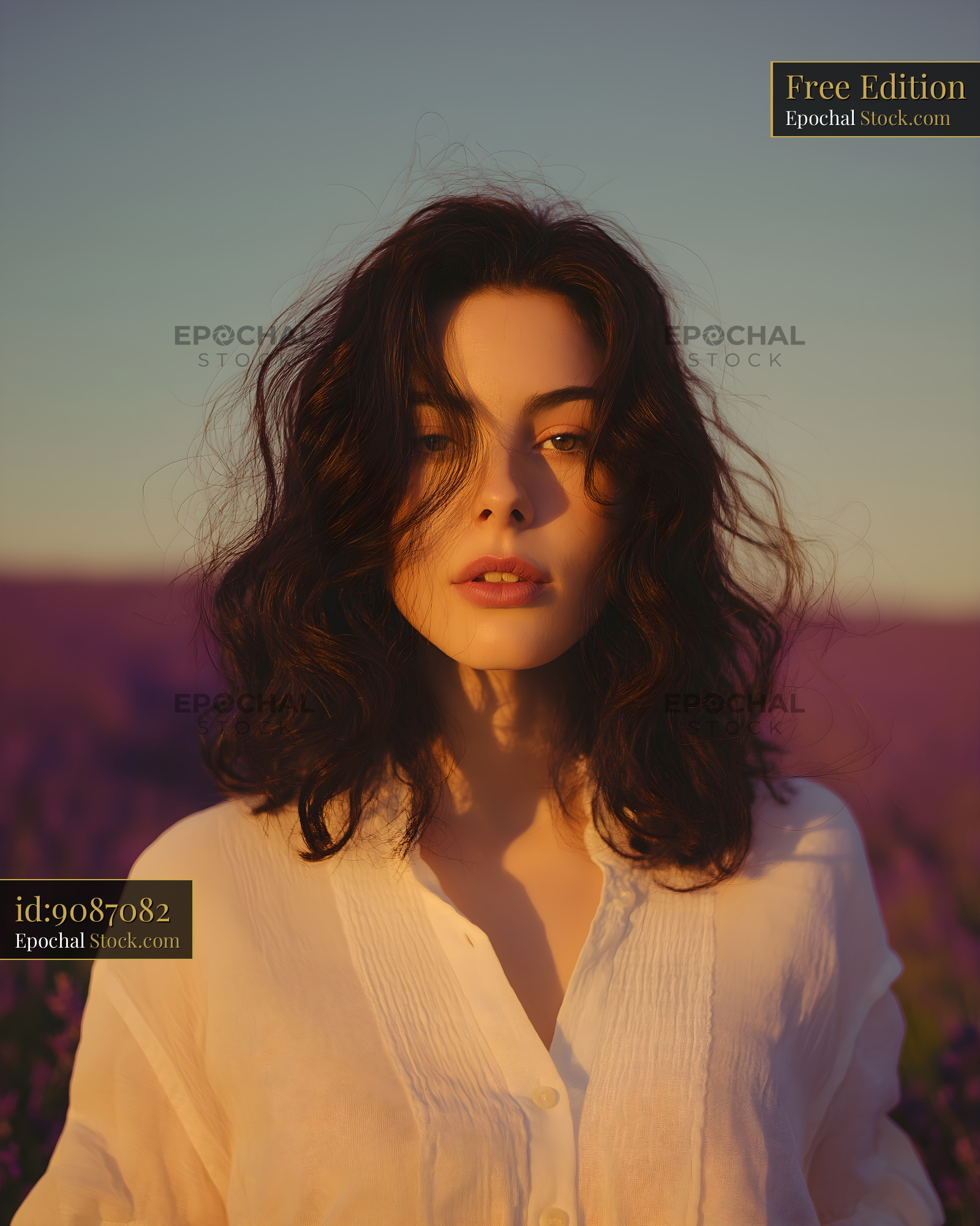 A woman stands in a lavender field. The sun sets in the background, creating a warm glow. Her hair moves with the gentle breeze. She looks directly at the viewer with a calm expression.