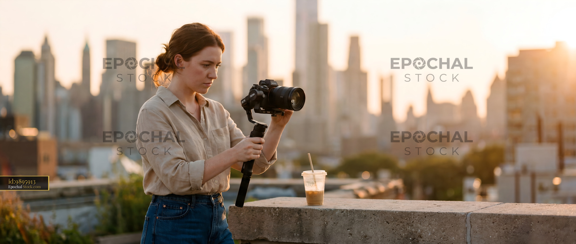 A woman stands on a rooftop in an urban setting. She holds a camera and prepares to take a picture. A drink sits on the ledge beside her as the sun sets behind tall buildings.