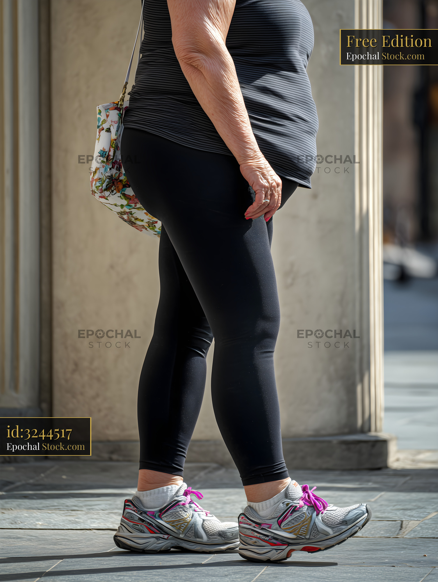 A woman walks in black leggings and a gray top. She wears running shoes with pink laces. The scene shows a city street with buildings in the background.