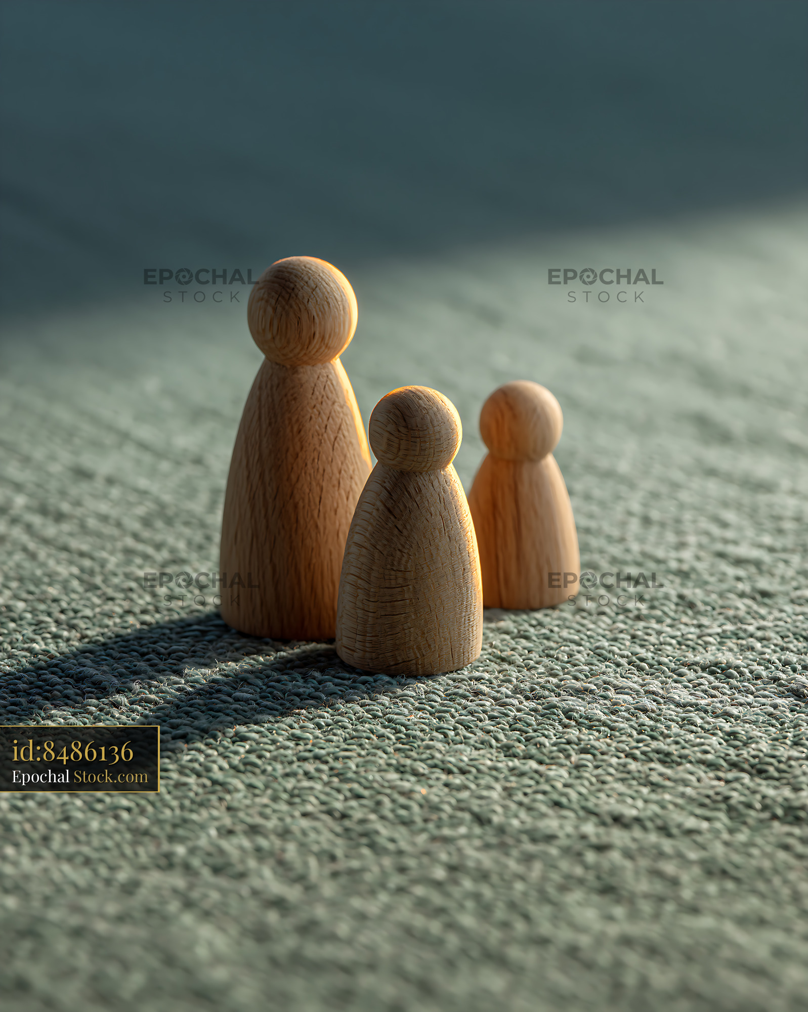 Minimalist wooden figures on a green textured surface symbolize family bonds and togetherness, evoking themes of parenting, systemic therapy, and protection in soft morning light.