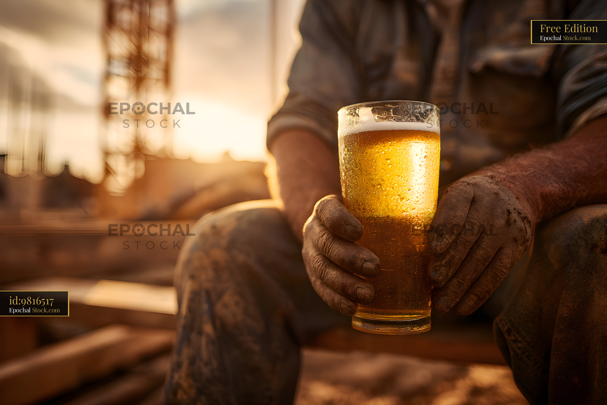 A person with dirty hands holds a glass of beer while sitting on a wooden beam. The sun sets in the background, casting a warm light. The scene shows relaxation after hard work.
