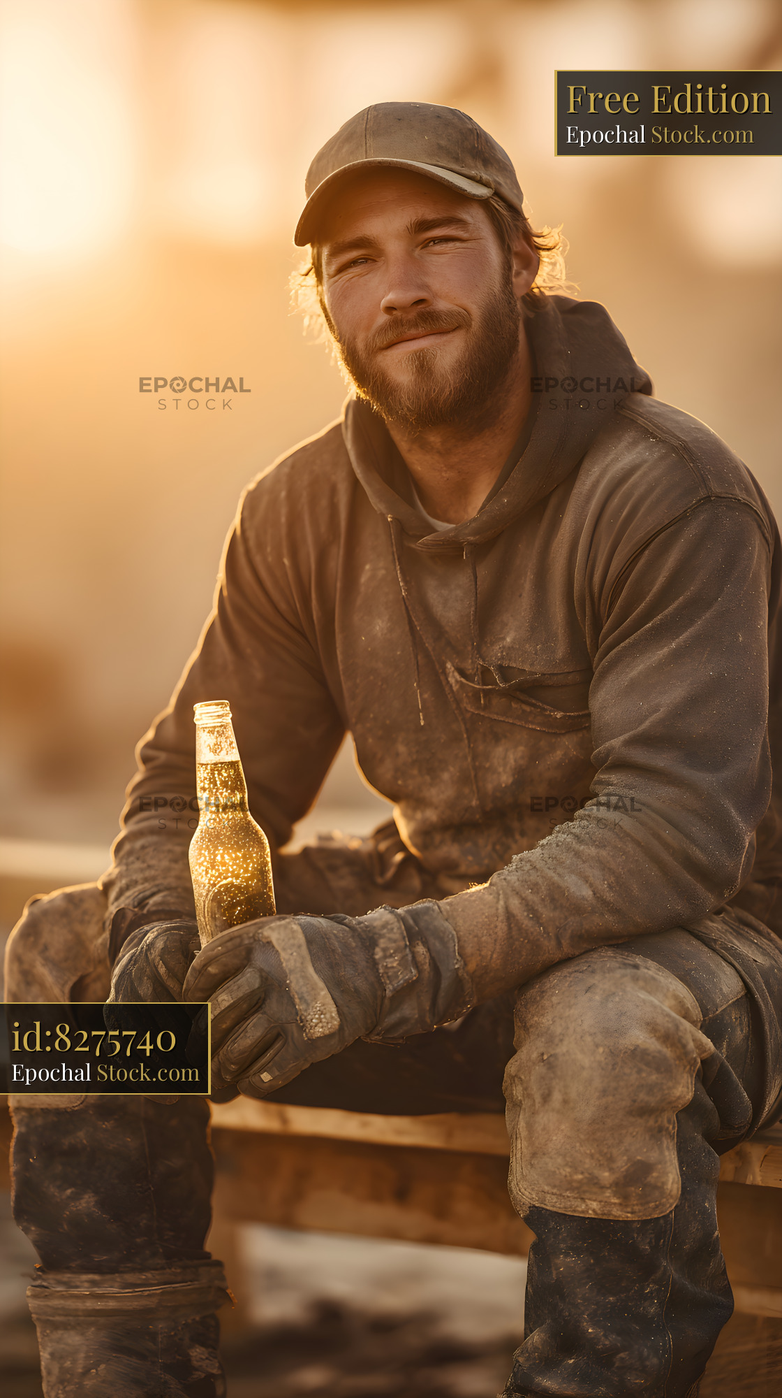 A worker sits on a wooden beam at a construction site during sunset. He holds a bottle while dressed in work clothes and gloves, taking a break from his tasks.