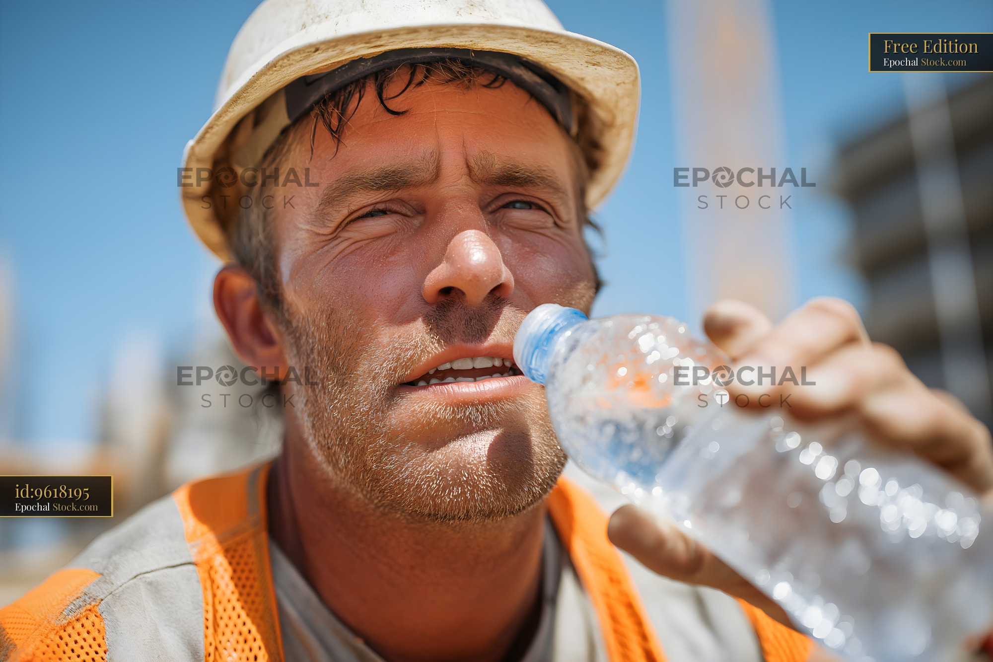 A worker at a construction site takes a moment to drink water while wearing a hard hat. The sun shines brightly, and buildings are under construction in the background.