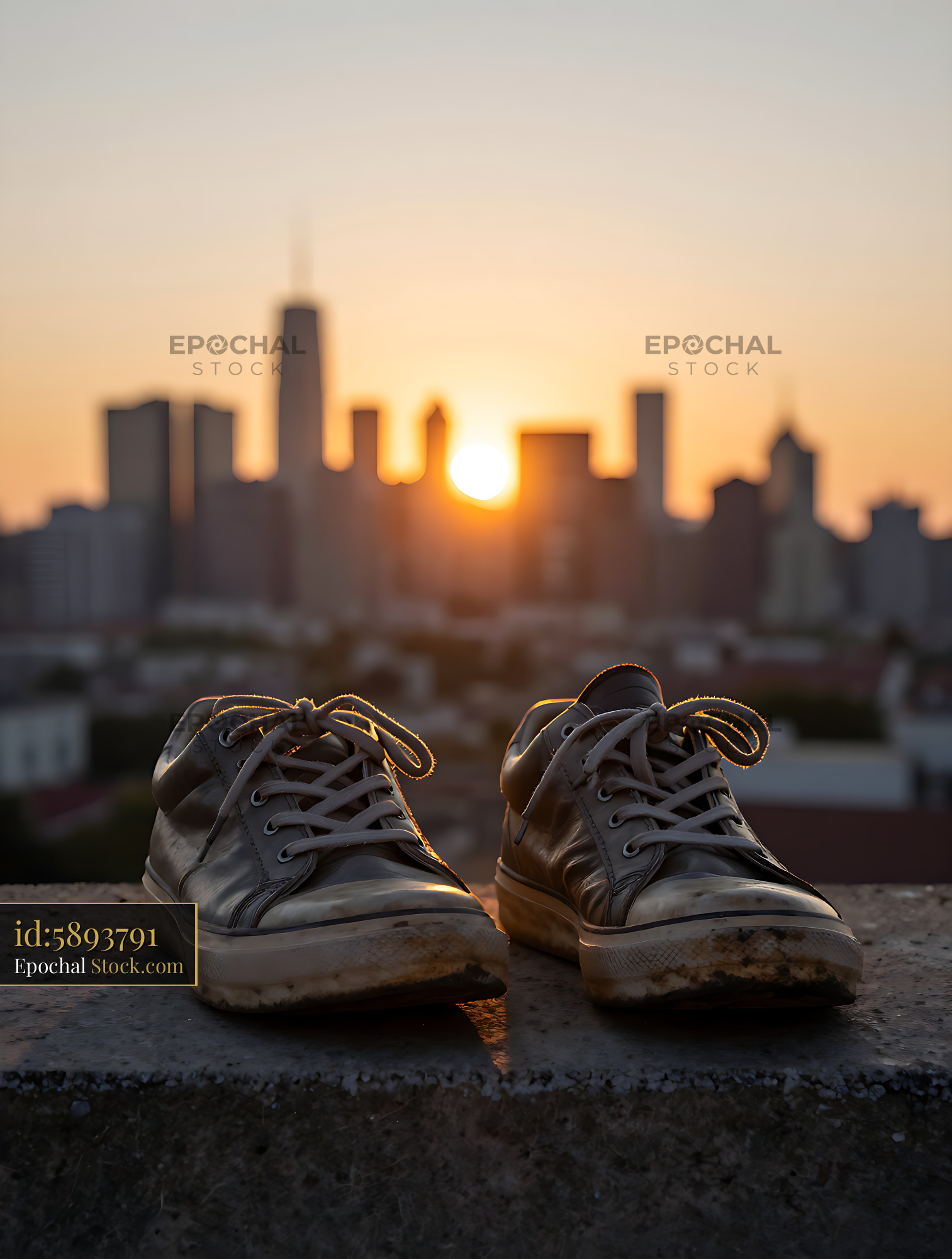 A pair of dirty, well-worn sneakers sits on a stone ledge against a blurred urban skyline during a golden sunset, evoking themes of a long journey, ambition, and city life.