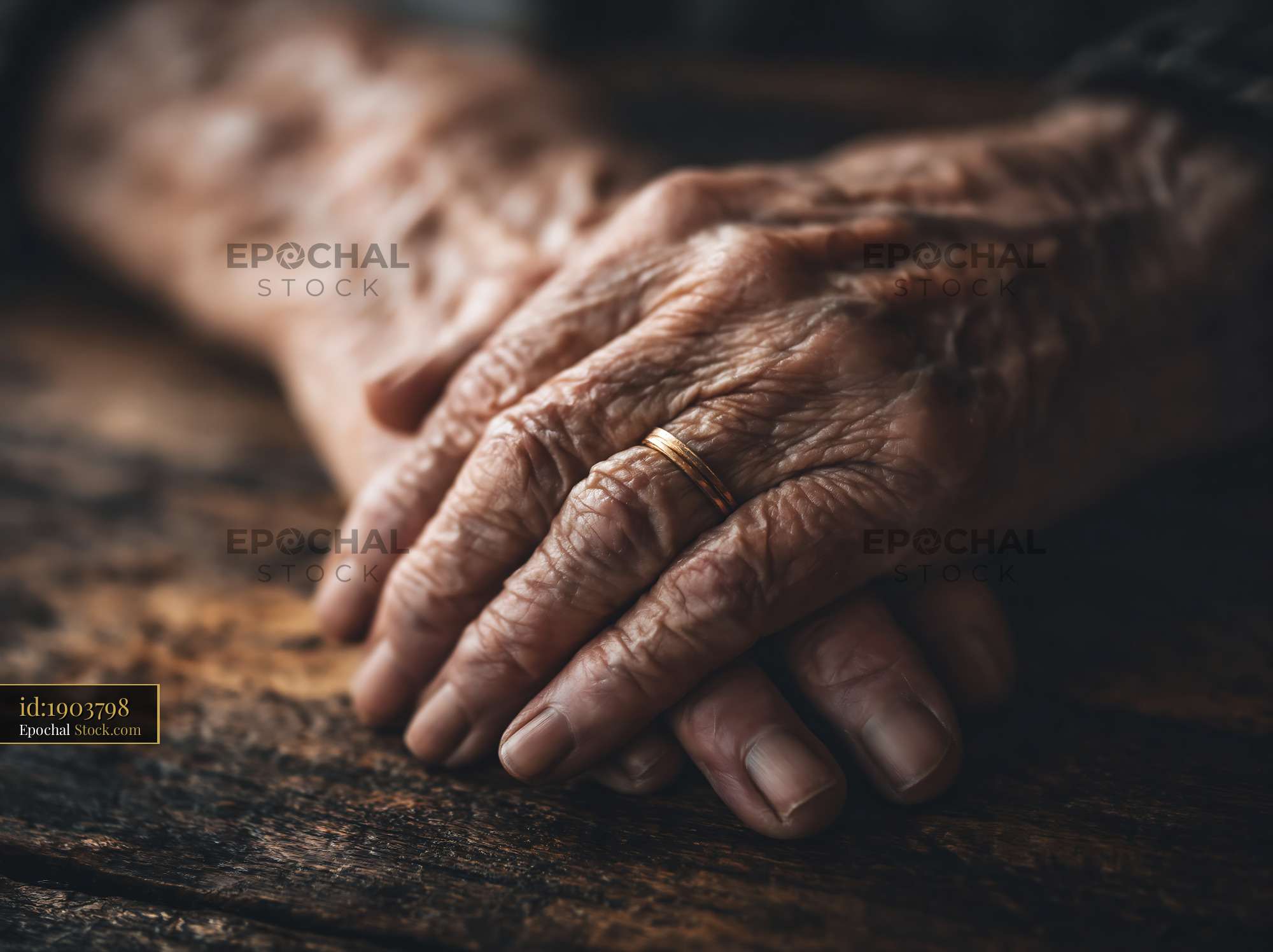 A poignant close-up of weathered, wrinkled hands featuring a gold ring on a rustic wooden surface, symbolizing a lifetime of commitment, wisdom, and the passage of time.