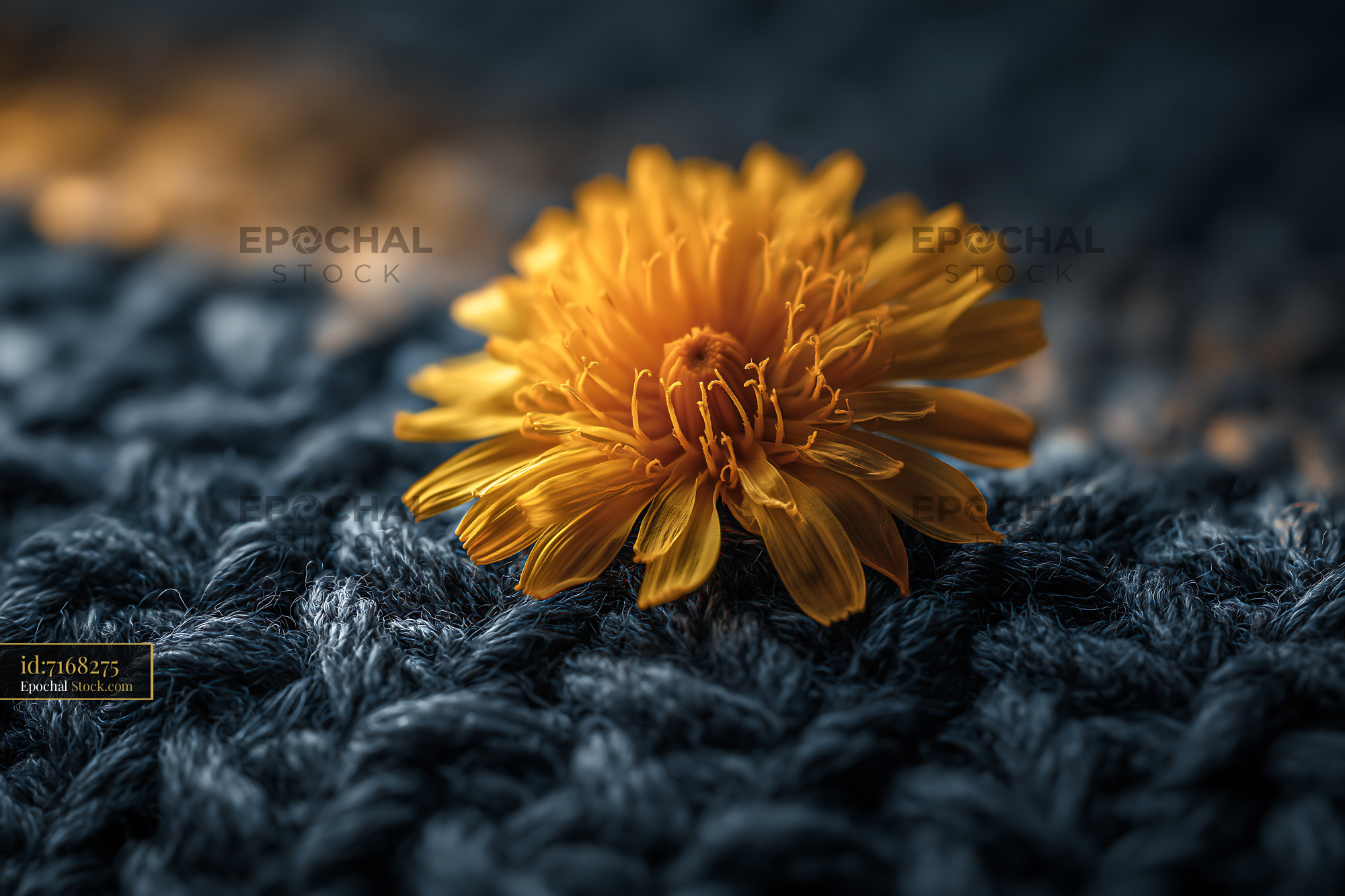 Yellow dandelion flower resting on a dark blue knitted wool blanket