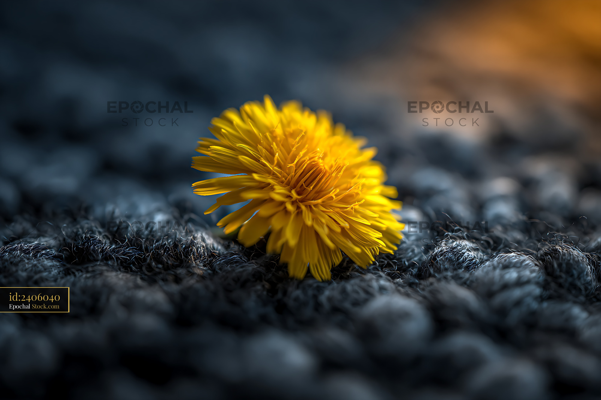 A single yellow dandelion bloom rests on a dark woolly texture, highlighted by warm light to evoke themes of resilience, hope, and finding beauty in darkness.