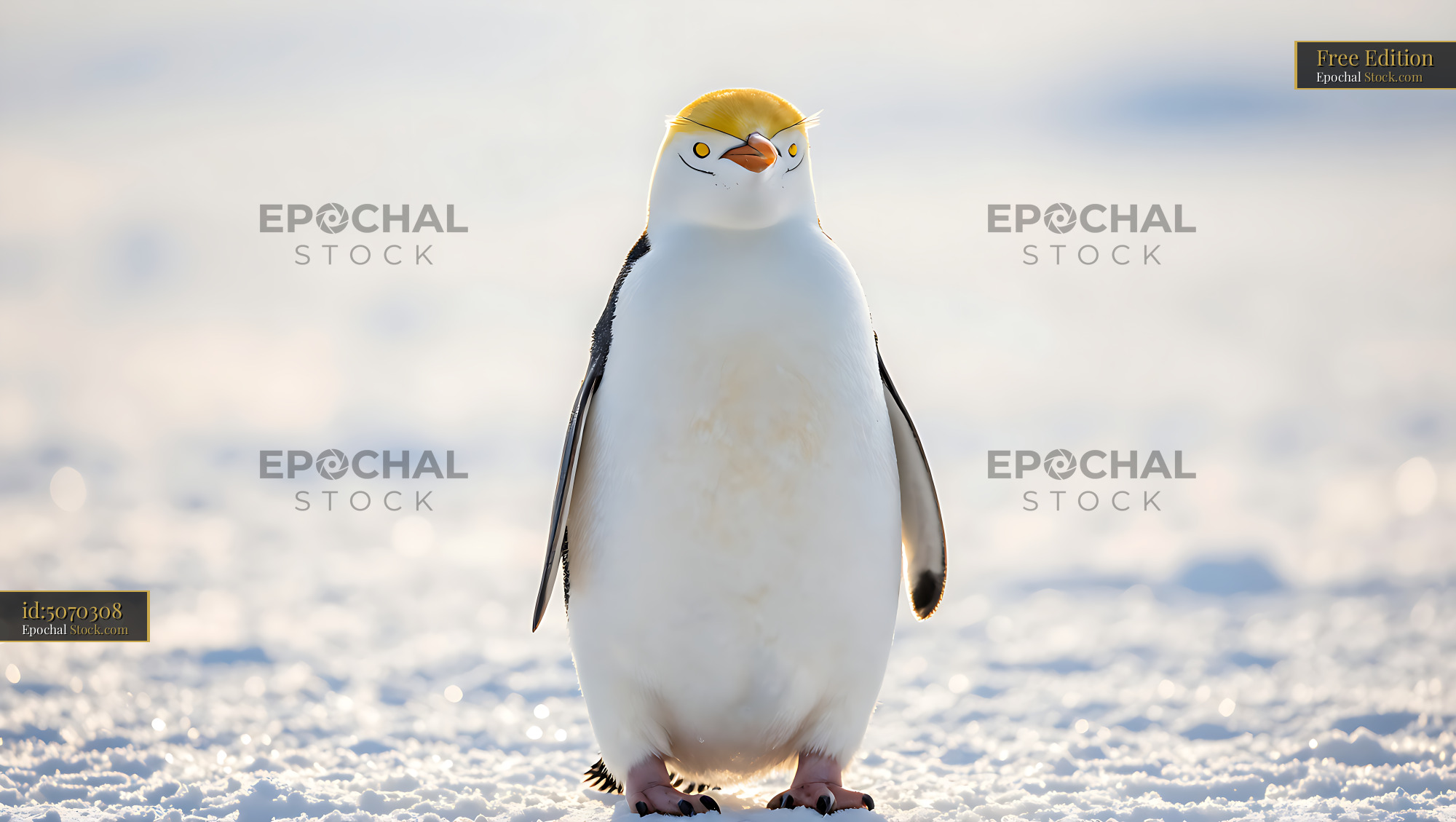 A rare yellow-eyed penguin stands majestically on a frozen landscape, its vibrant eyes reflecting the sun, evoking themes of wildlife conservation and endurance in the cold.