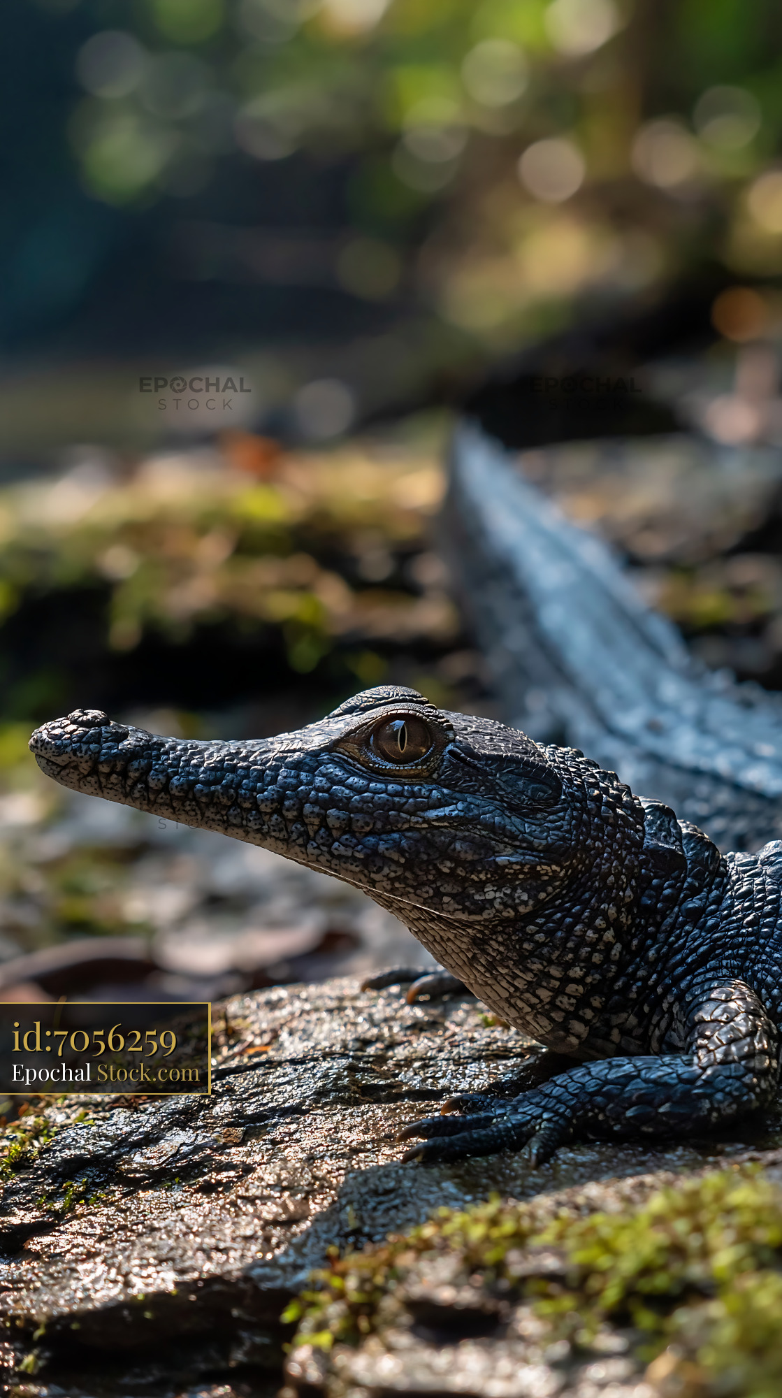 A close-up of a young alligator with textured skin resting on a sunlit mossy rock in its natural habitat, capturing a moment of quiet alertness and wildlife serenity.