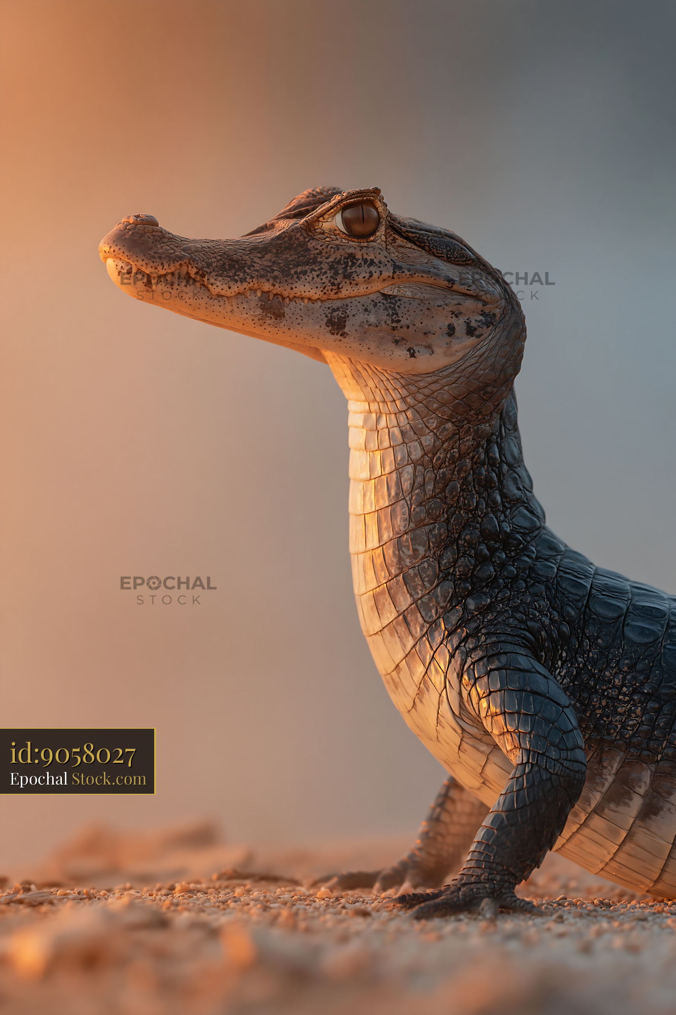 Young alligator standing in warm golden light