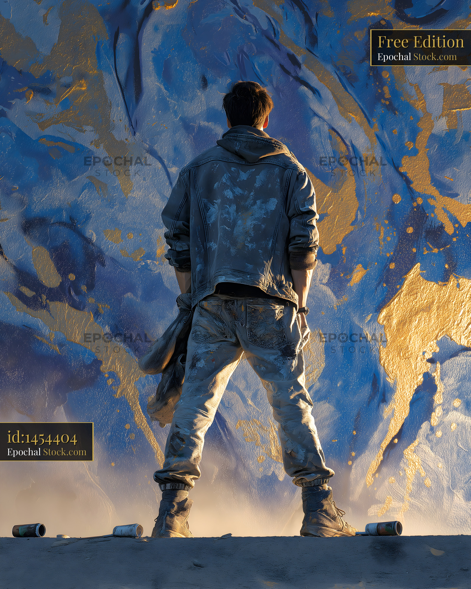 Young artist stands before colorful mural at sunset Free Premium Stock Image