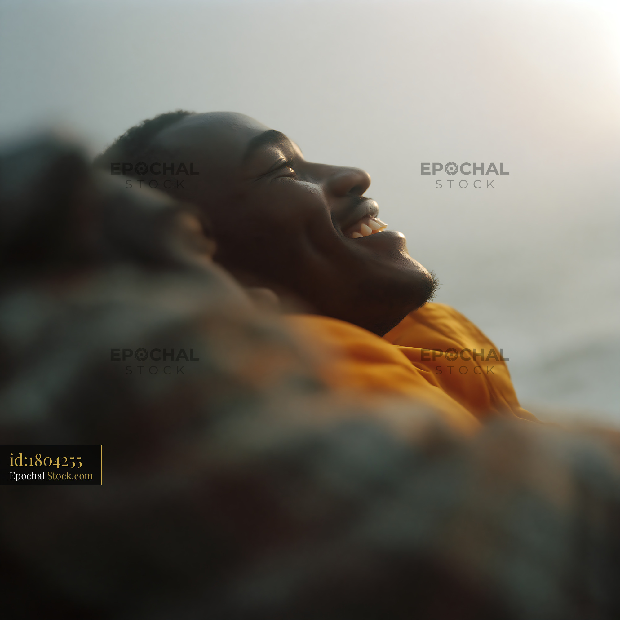 A joyful young African American man laughs with his eyes closed, basking in the warm glow of the sun, conveying a sense of pure happiness, inner peace, and freedom.