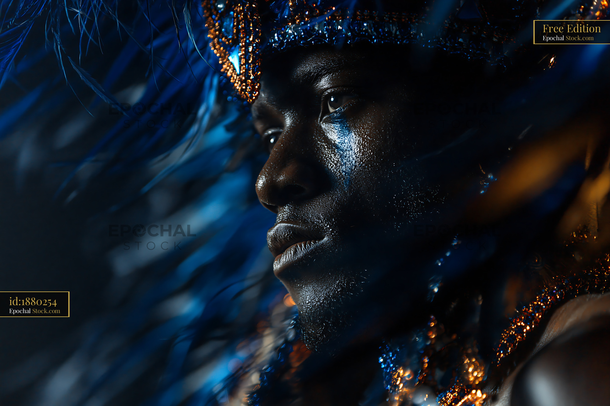A dramatic close-up of a young Black man in a vibrant blue carnival costume with intricate feathers and face paint, evoking themes of cultural heritage and intense performance pride.