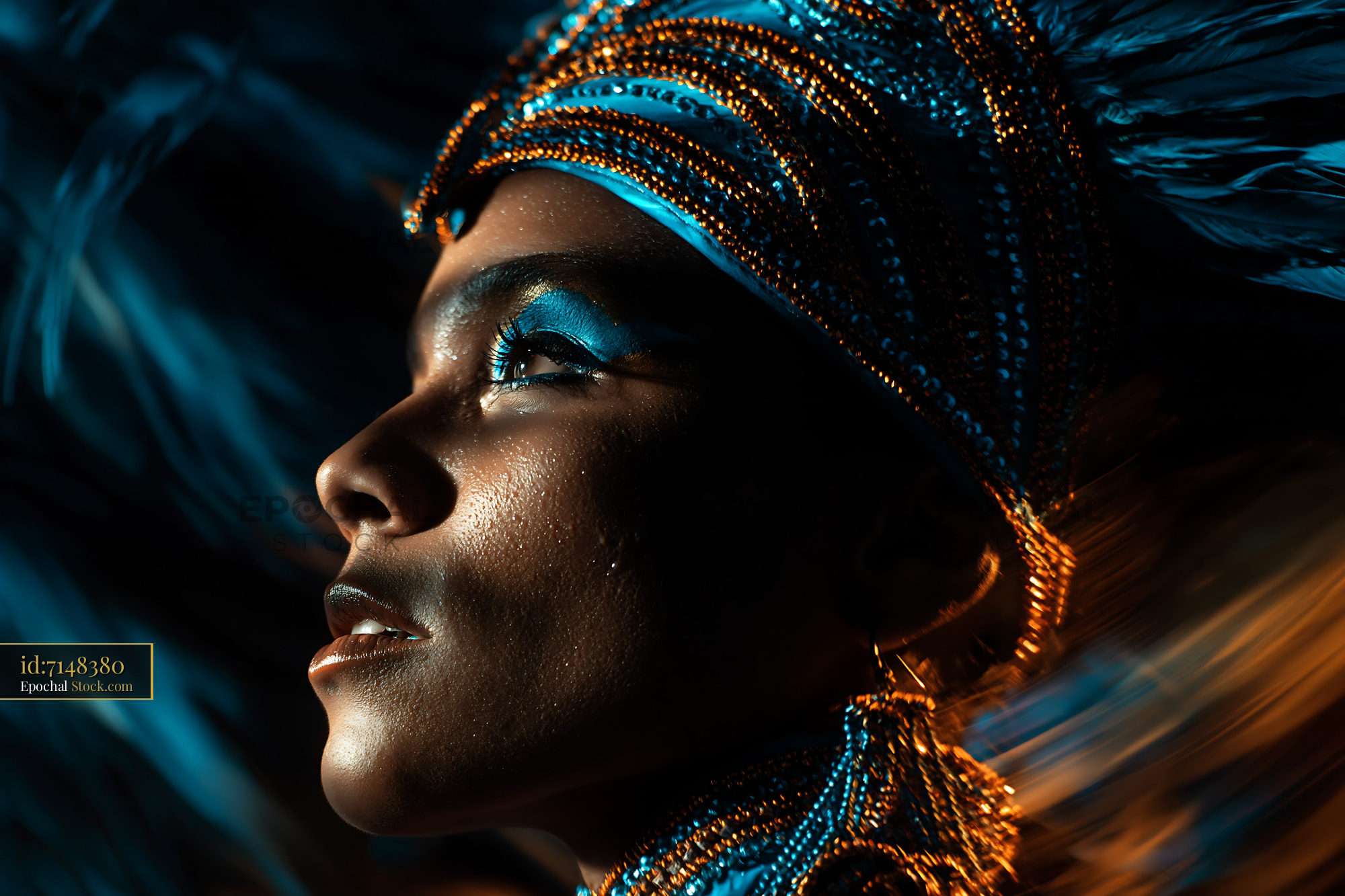 A profile portrait of a young Black woman wearing an elaborate feathered headpiece and beaded jewelry, capturing the vibrant spirit and regal pride of a carnival celebration.