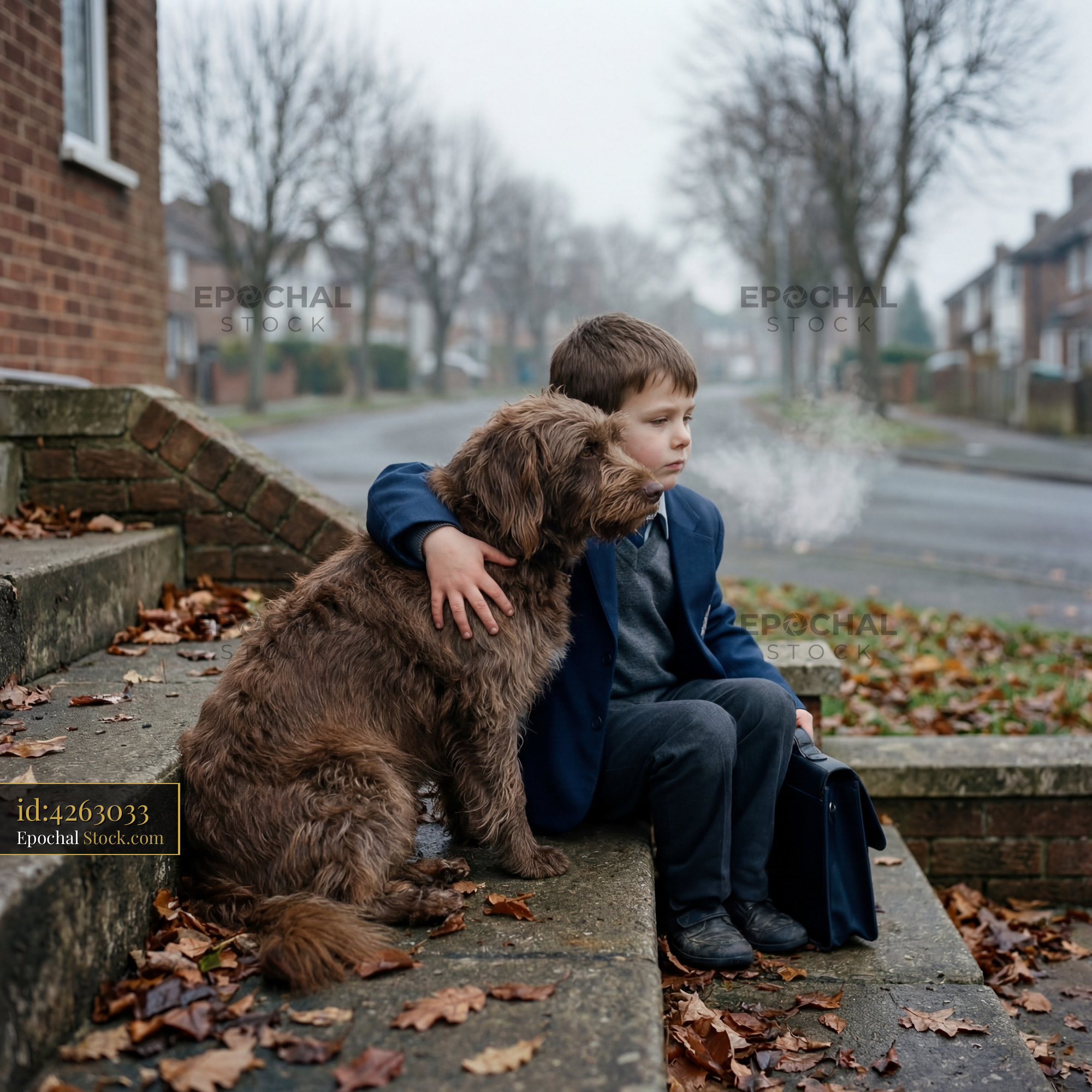 A young boy in a suit sits on steps next to a dog. They look away from the camera on a cloudy morning. Leaves cover the ground and houses appear in the background.
