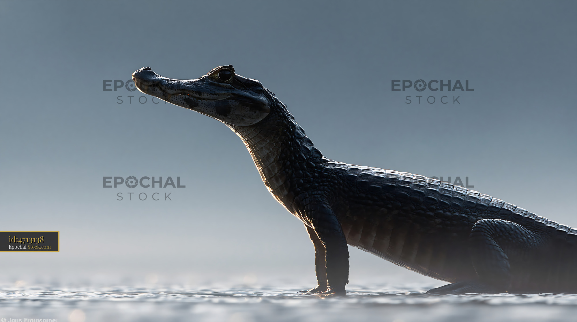 A young caiman stands alert in calm, shallow water at dawn, backlit by the soft morning light, capturing a moment of wild stillness and natural grace.