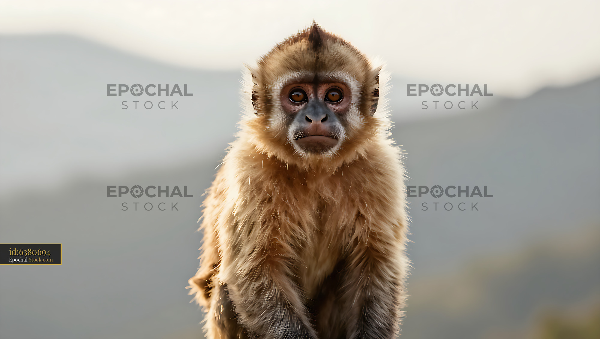 A curious young capuchin monkey stares soulfully into the lens against a soft mountain backdrop, capturing a moment of pure innocence and connection with the natural world.