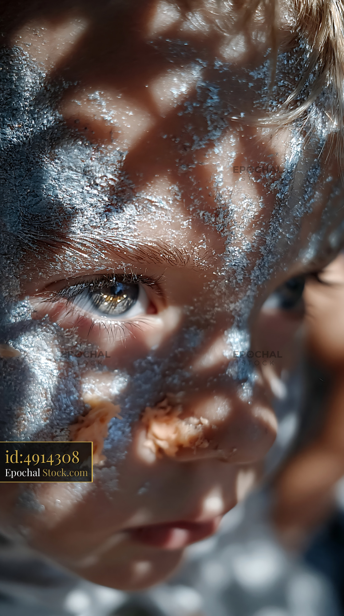 A close-up portrait of a young child with shimmering silver glitter and orange face paint, exploring themes of childhood wonder, creative play, and sensory experience in natural light.