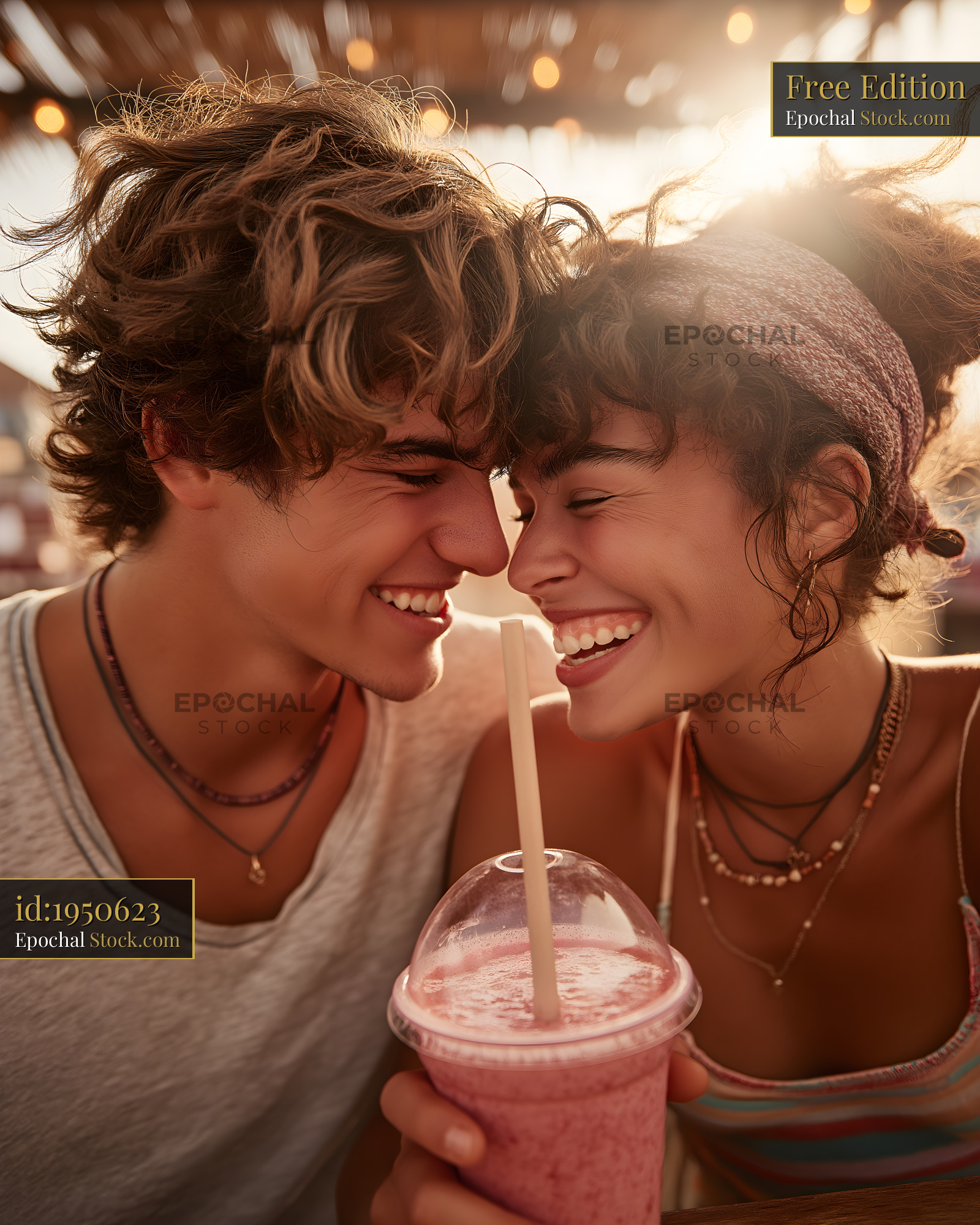 Two young people lean close to each other, smiling as they enjoy a drink together. The background shows a warm sunset with soft lights around them.