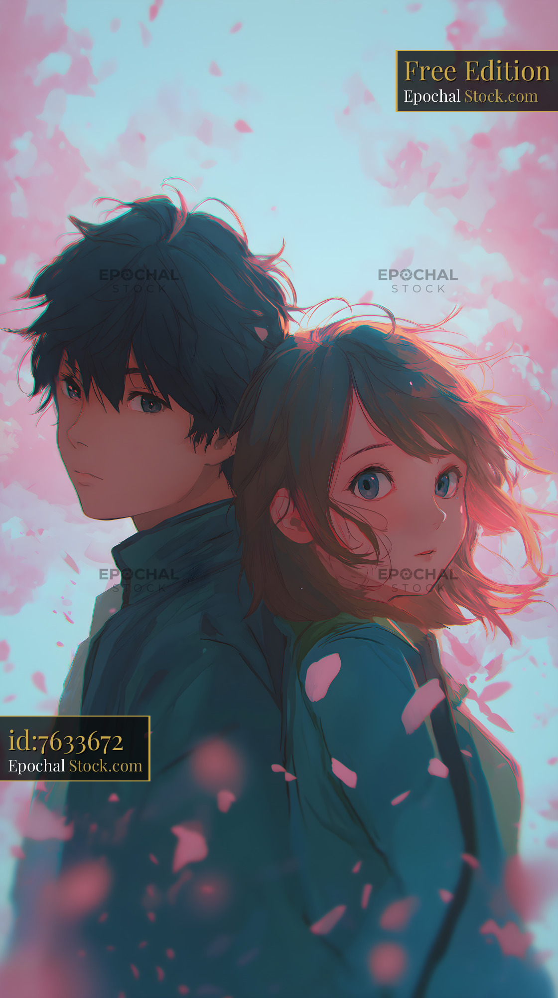 A young man and a young woman stand back to back in a scene filled with cherry blossoms. The background shows a blend of soft colors. It is a moment capturing their connection in spring.