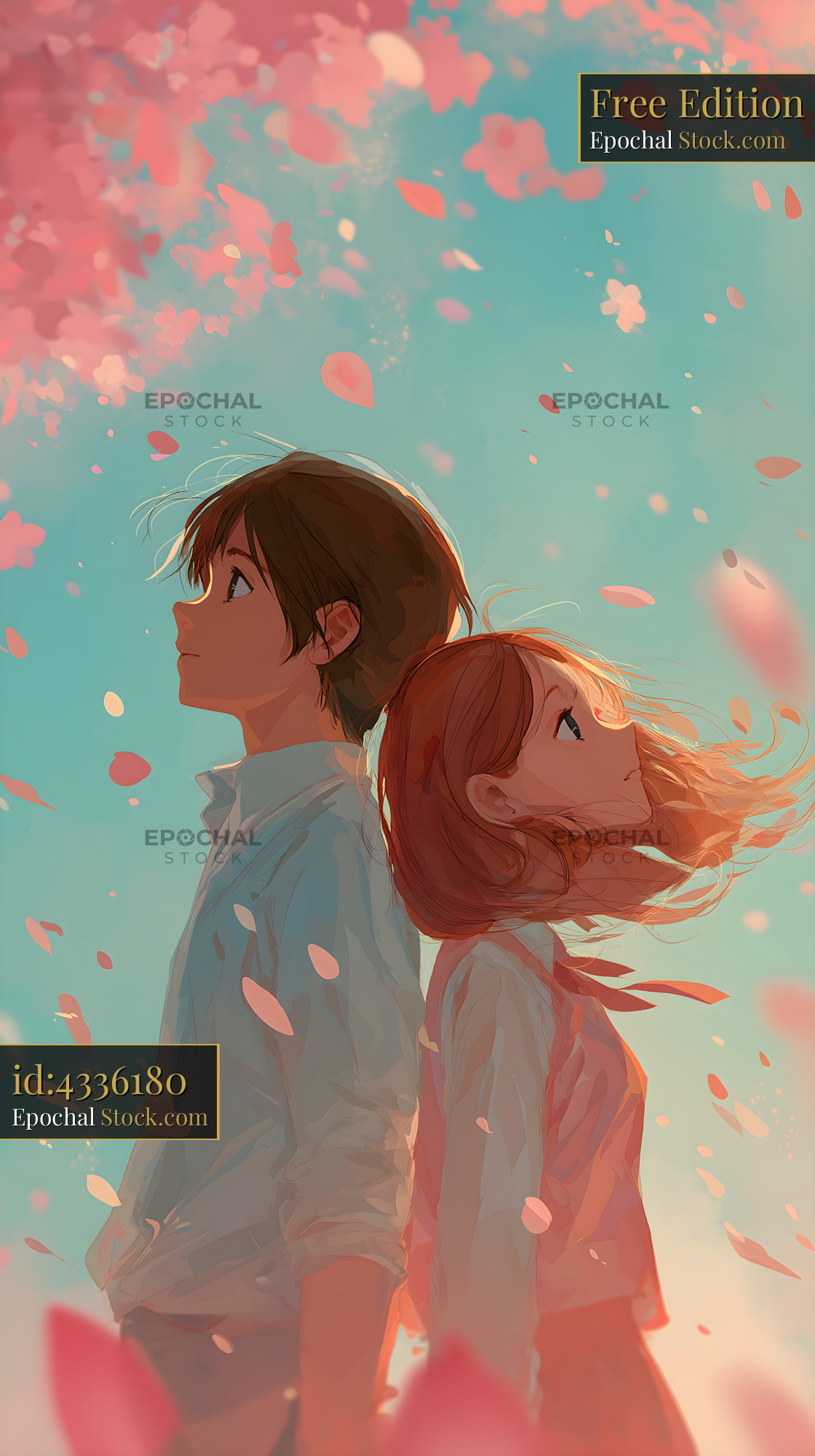 Two people stand side by side, looking upwards. They are surrounded by pink cherry blossom petals falling from the trees under a blue sky. The scene captures a moment in springtime.