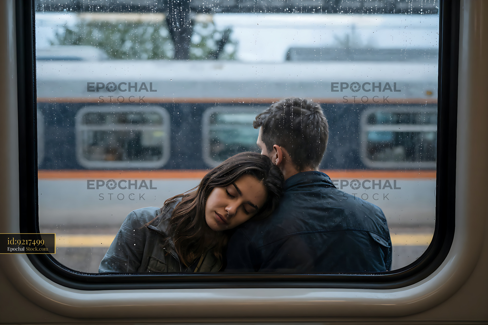 A young woman rests her head on her partner's shoulder while looking out a rain-streaked train window, evoking a sense of quiet intimacy, comfort, and the melancholy of travel.