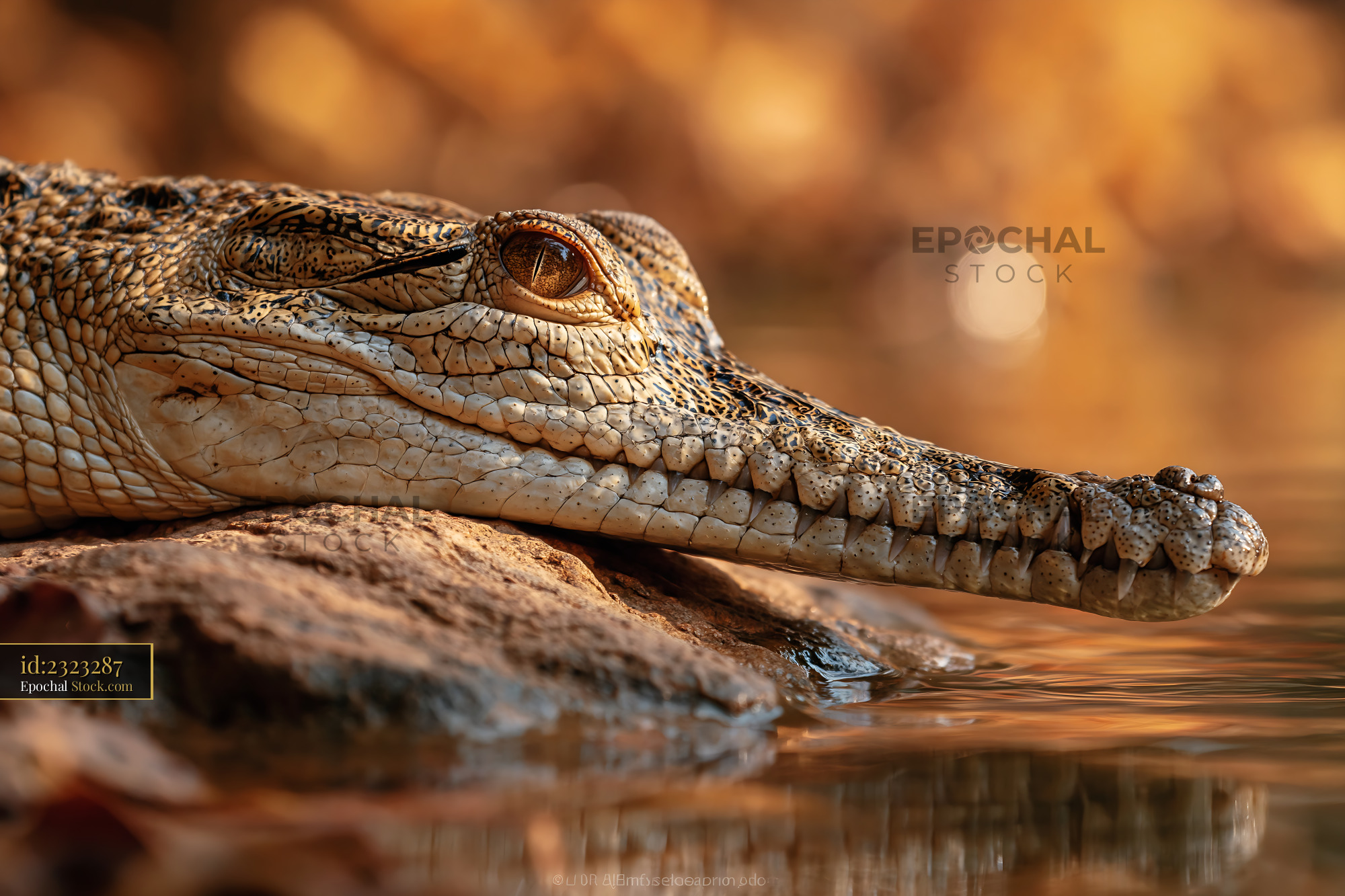 A detailed close-up of a young crocodile head resting patiently on a rock, bathed in warm sunset light, reflecting themes of ancient nature, patience, and wildlife survival.