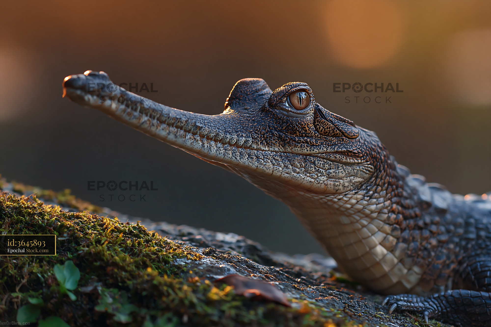 Young gharial resting on mossy rock during golden hour