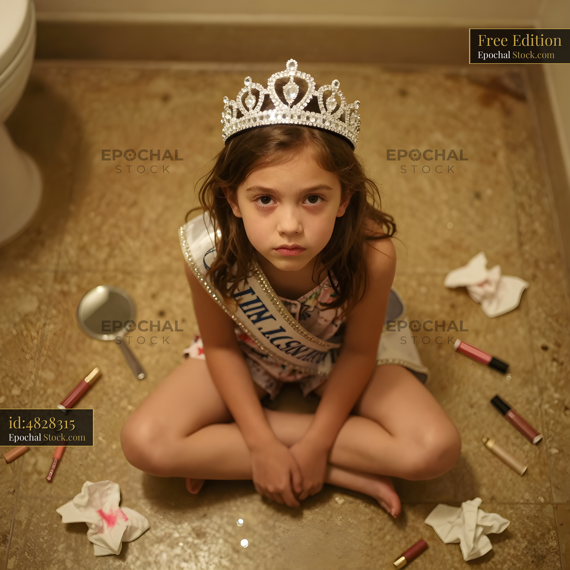A girl sits on the floor of a bathroom with a crown on her head. She looks serious. Makeup items and tissues are scattered around her. A small mirror is nearby, showing her reflection.