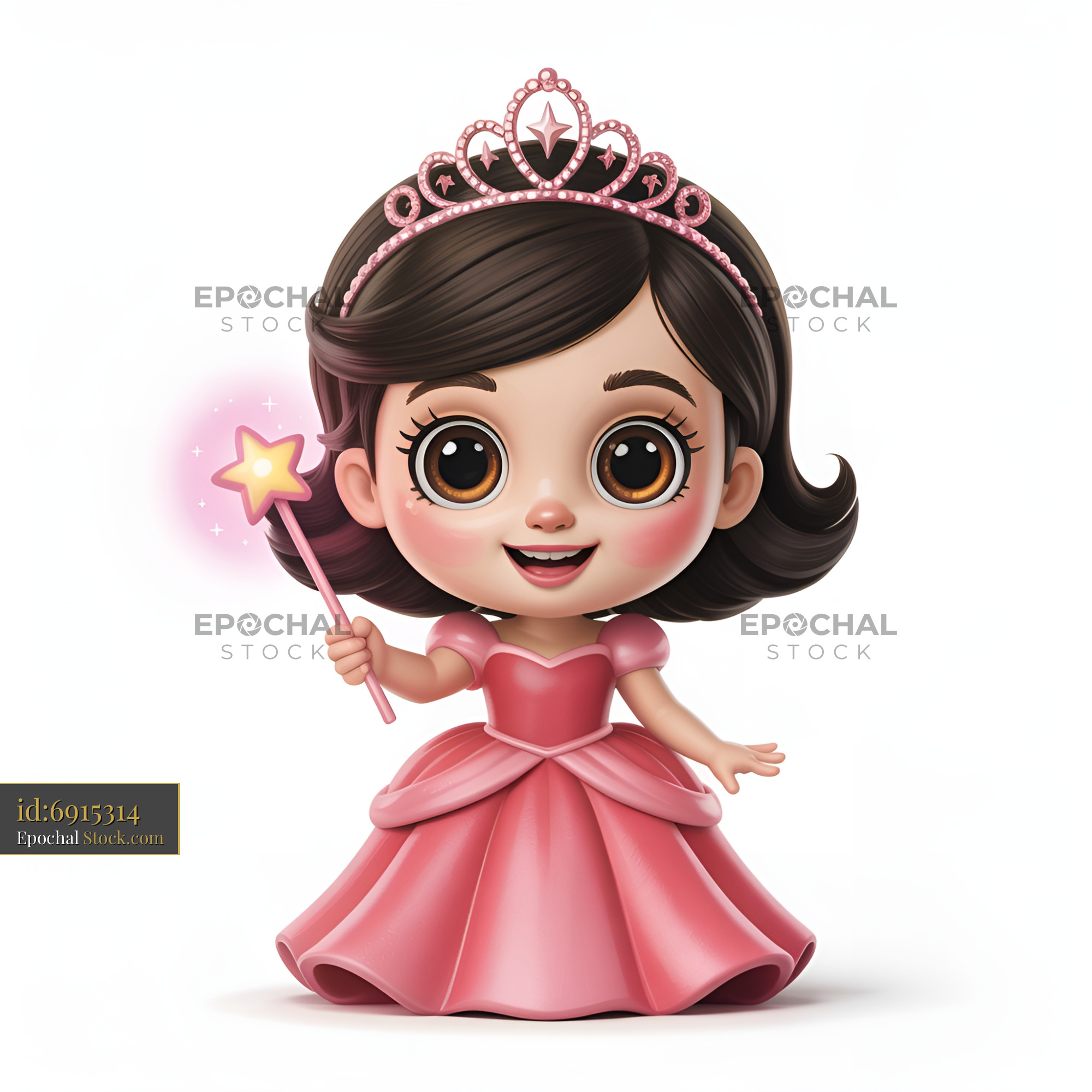 A young girl smiles while wearing a pink dress and a crown. She holds a star-tipped magic wand and stands playfully, ready for her next adventure.