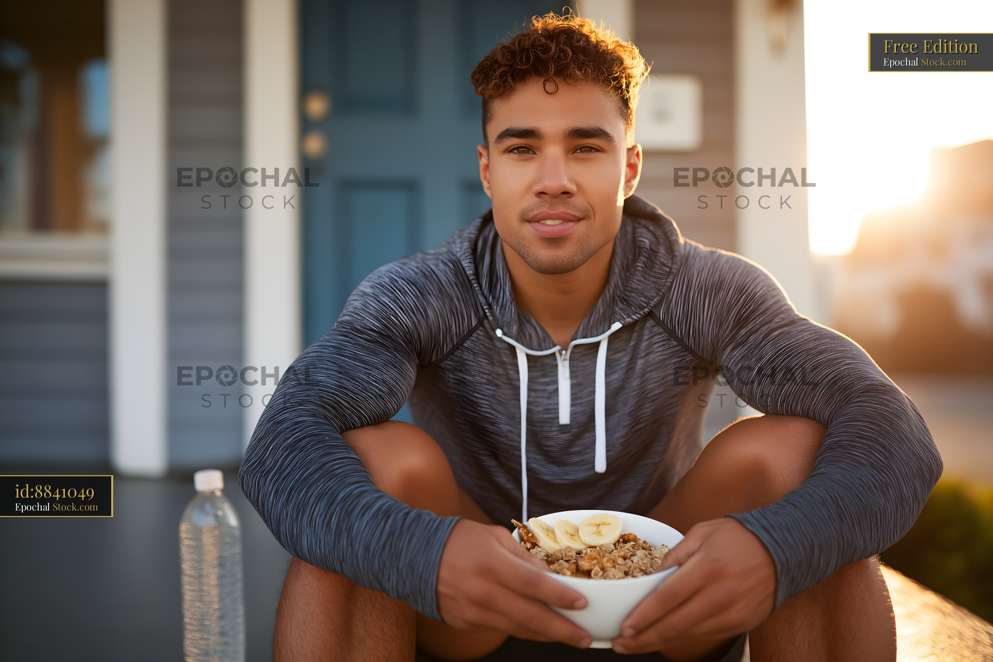 A man sits on a porch with a bowl of cereal and banana slices. He holds the bowl with both hands while a water bottle sits nearby. The sun shines in the background.