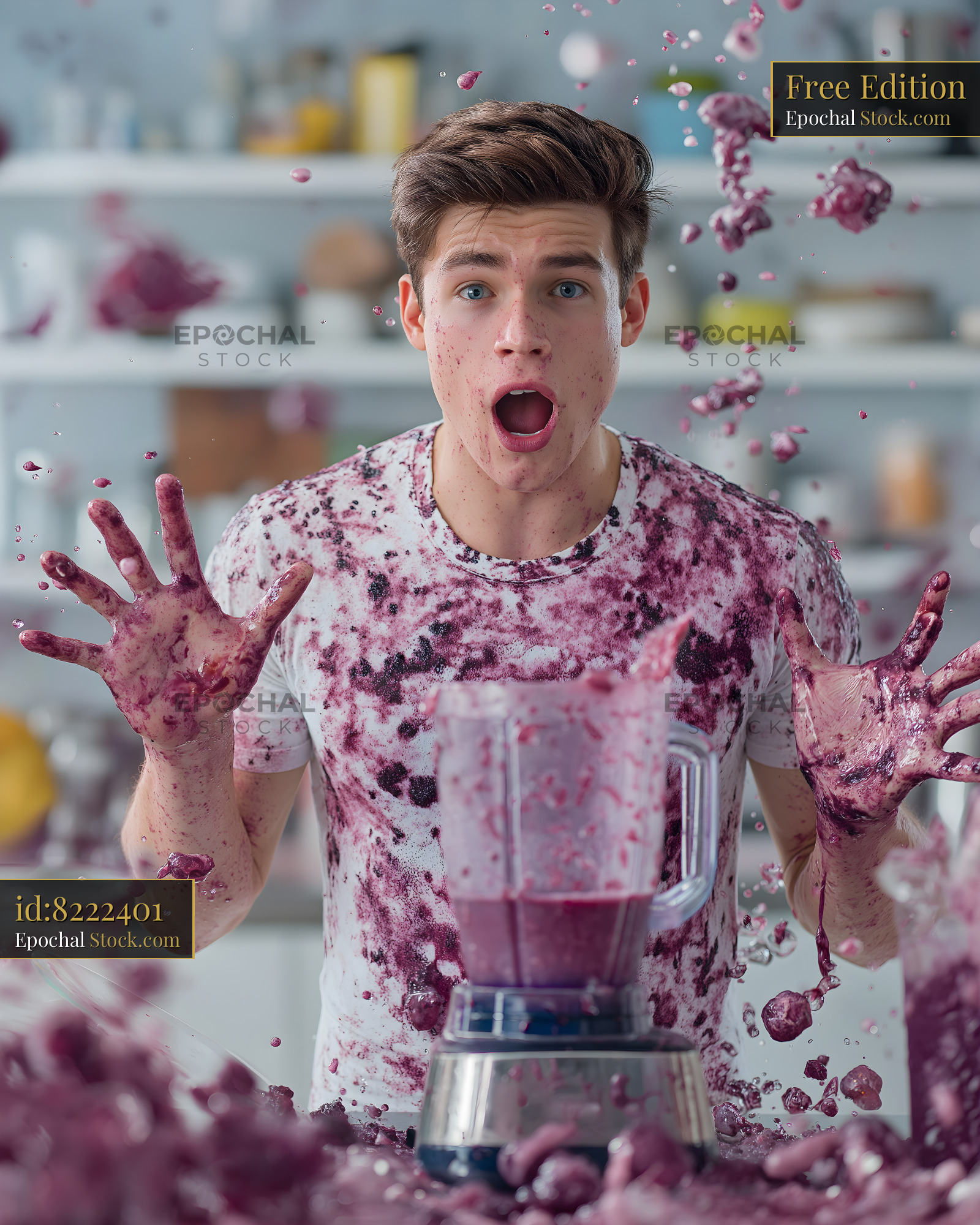 A young man stands in a kitchen, surprised as smoothie spills from a blender. Purple smoothie covers his hands and shirt. The kitchen has various items in the background.