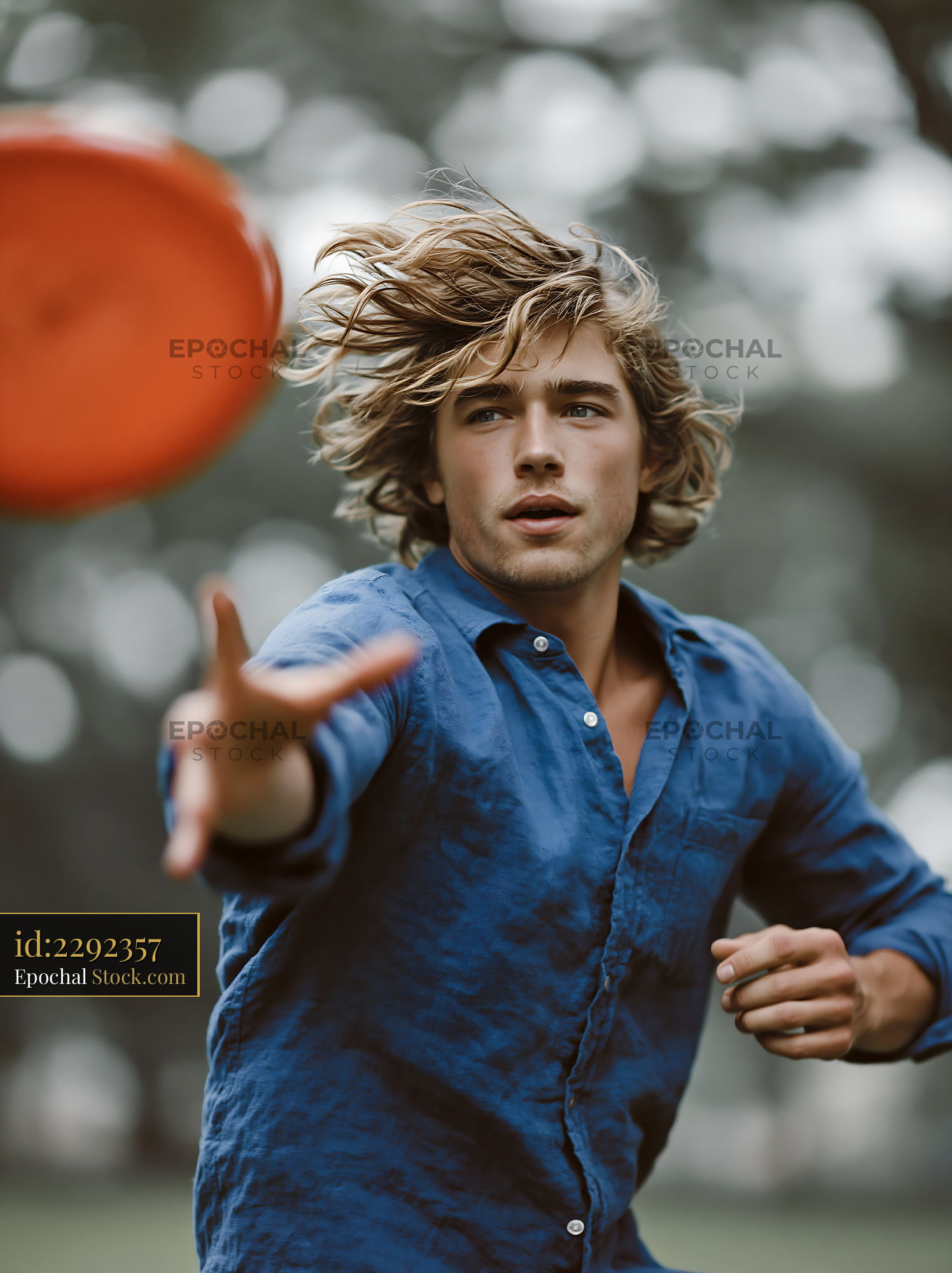 A focused young man in a blue linen shirt reaches for a flying orange frisbee outdoors, capturing a moment of summer leisure, athletic agility, and youthful energy.