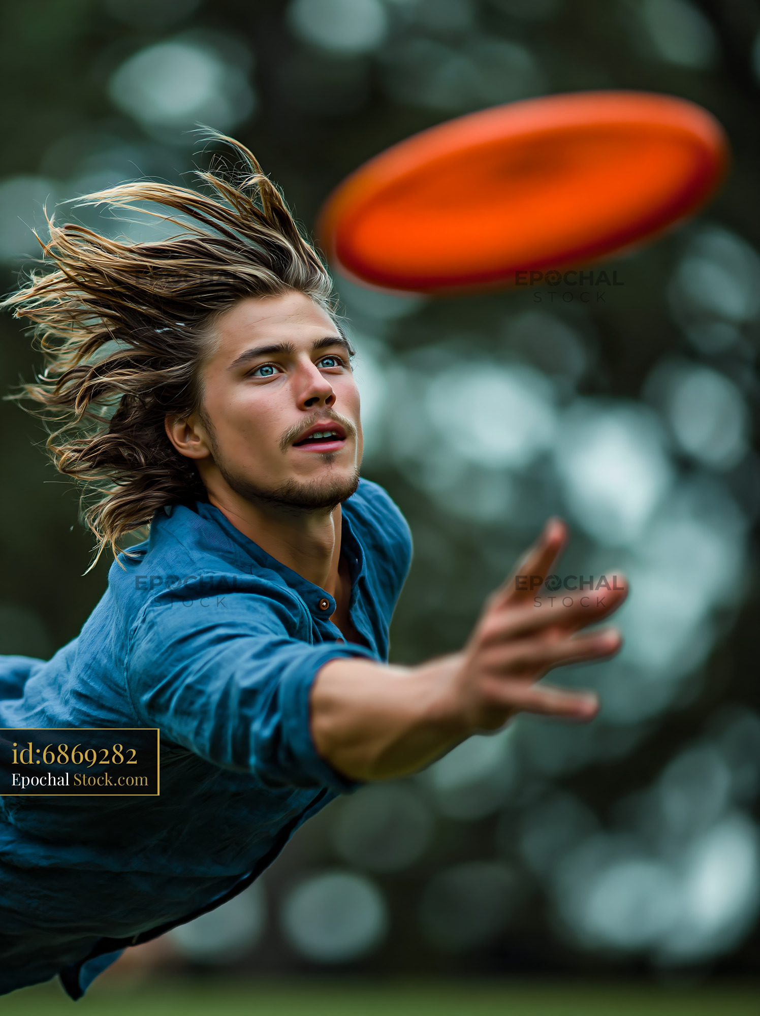 Young man with long hair catching a flying disc in the park