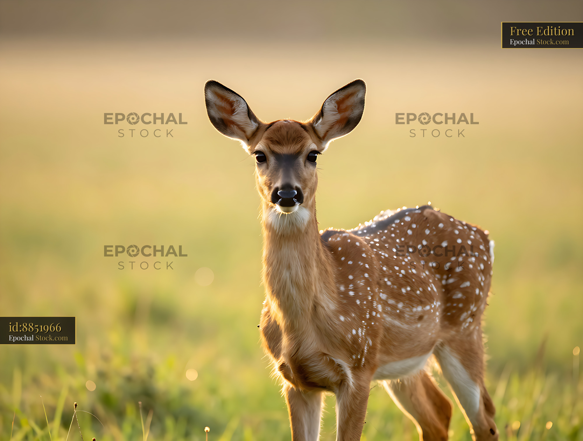 Young spotted fawn standing in a sunlit meadow during golden hour