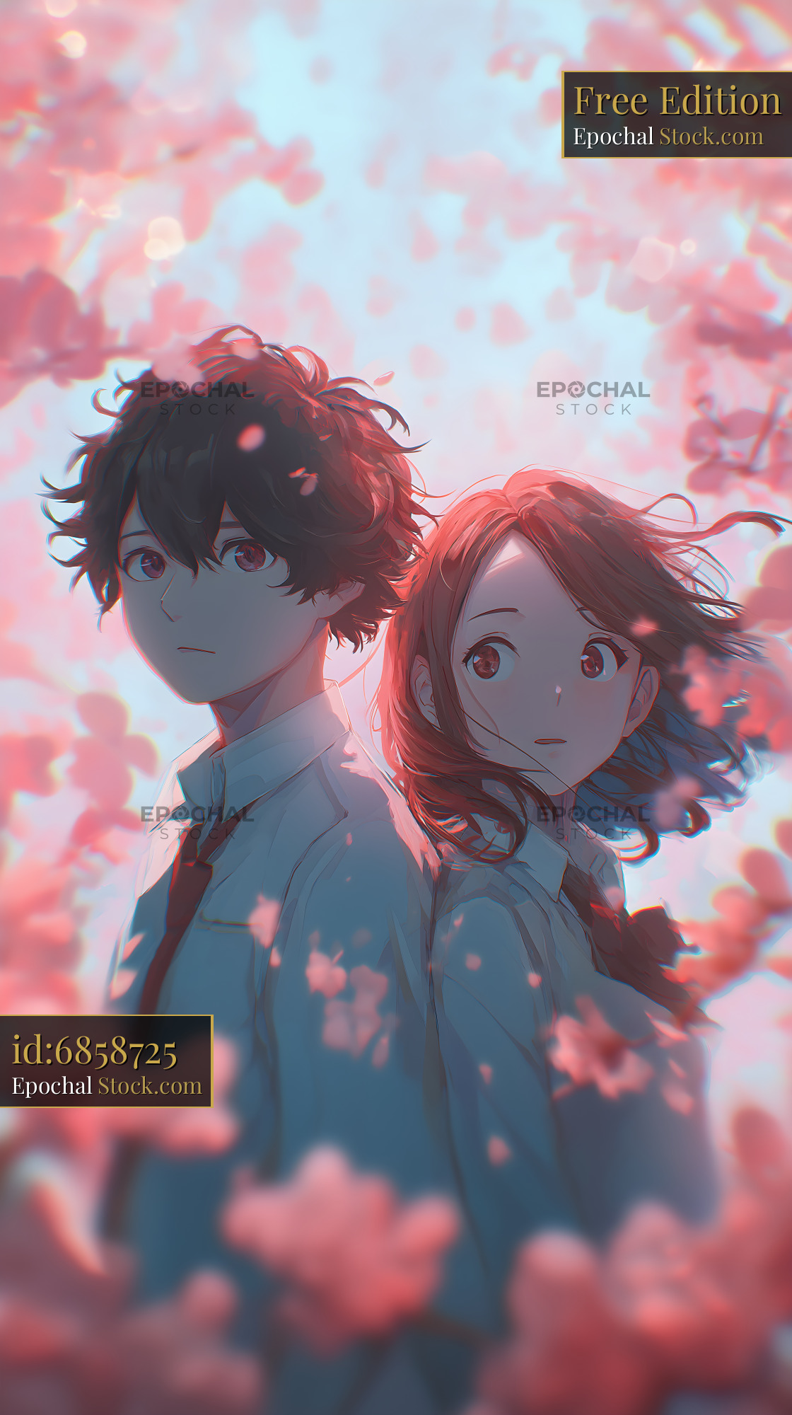 Two students stand back to back in a cherry blossom setting. The spring flowers surround them as soft light filters through the petals. They appear thoughtful and focused on something ahead.