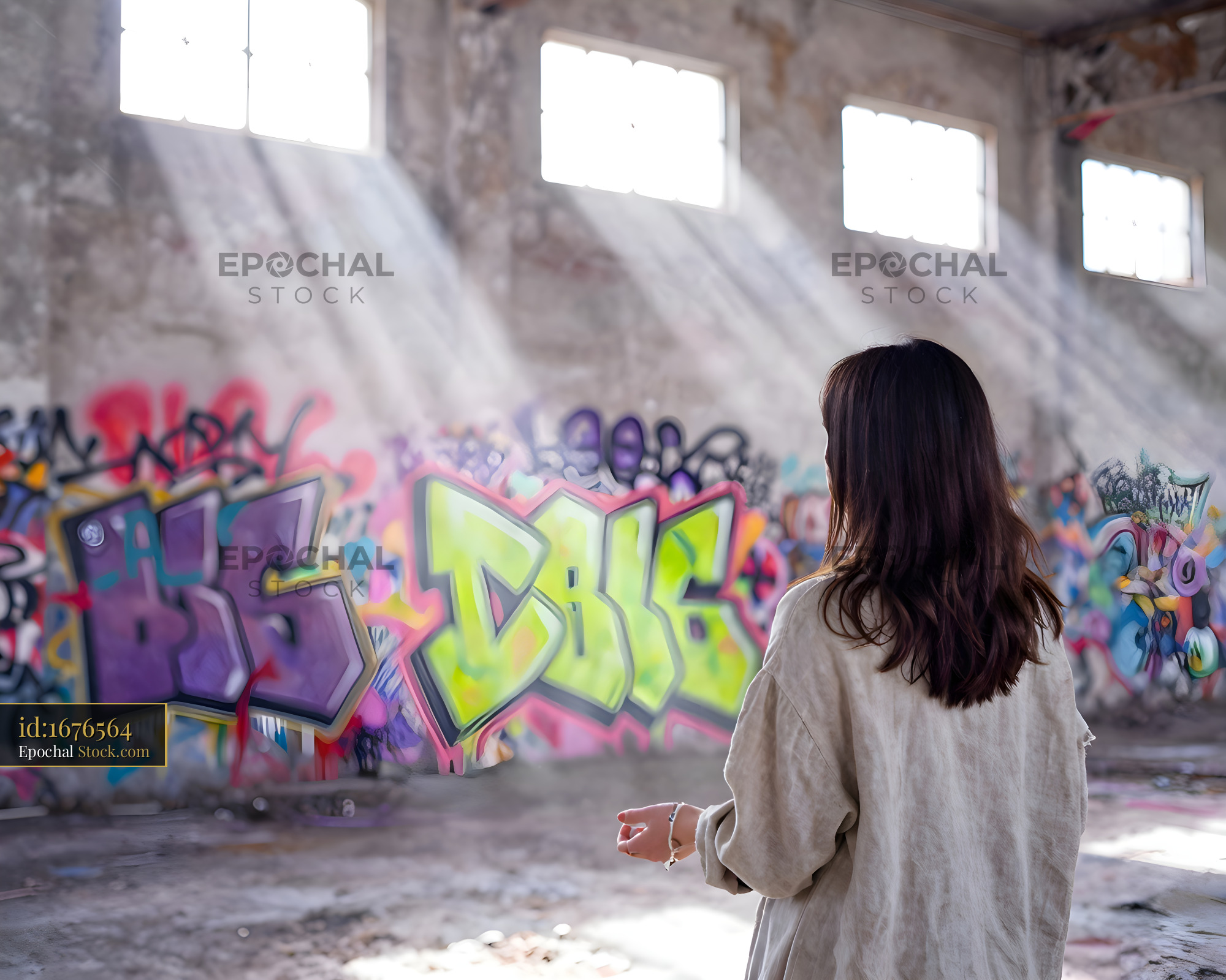 A woman stands in an old building, looking at colorful graffiti on the wall. Sunlight shines through the windows, creating a bright atmosphere in the space.