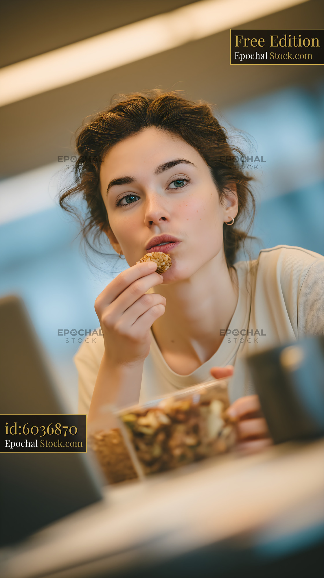 A woman eats a snack while sitting at a desk. She looks thoughtful as she holds a piece of food in her hand. A computer and a drink are nearby.