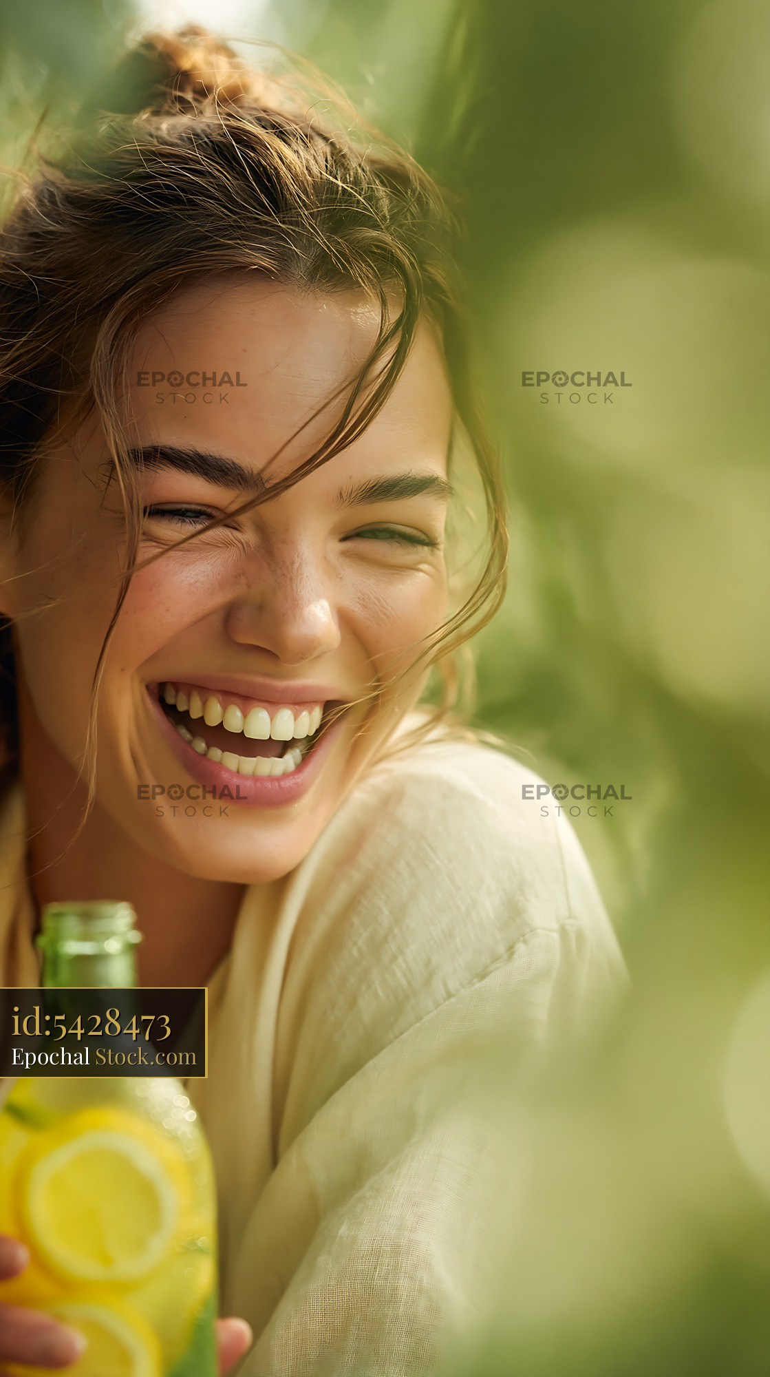 A joyful young woman with a radiant smile enjoys a refreshing homemade lemonade in a sun-drenched garden, capturing a moment of pure summer happiness and carefree living.