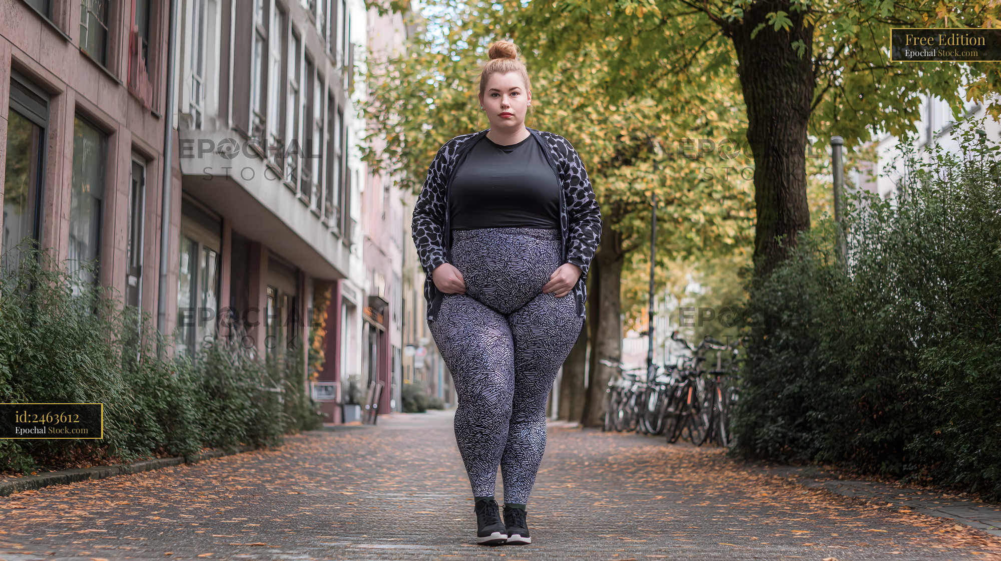 A young woman walks confidently on a city street. She wears workout clothes and has her hands in the pockets. Trees line the pathway, showing signs of autumn with leaves on the ground.
