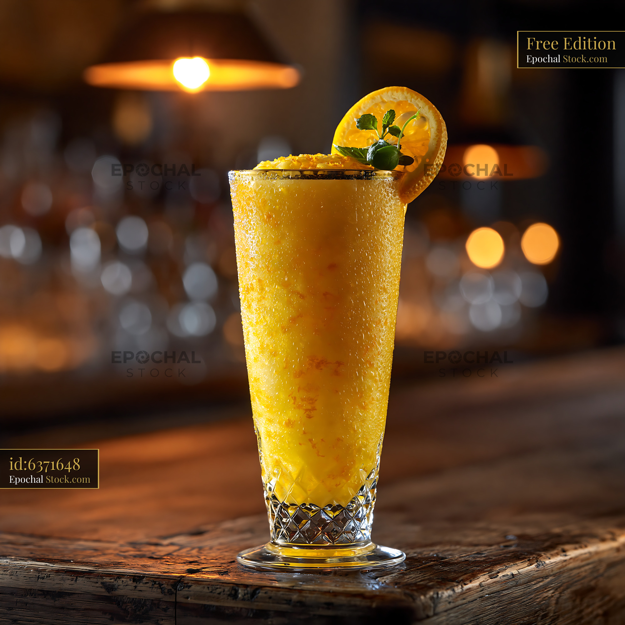 A refreshing yuja citron smoothie served in a frosted glass on a wooden bar counter, capturing a warm evening atmosphere and the vibrant, healthy taste of citrus.