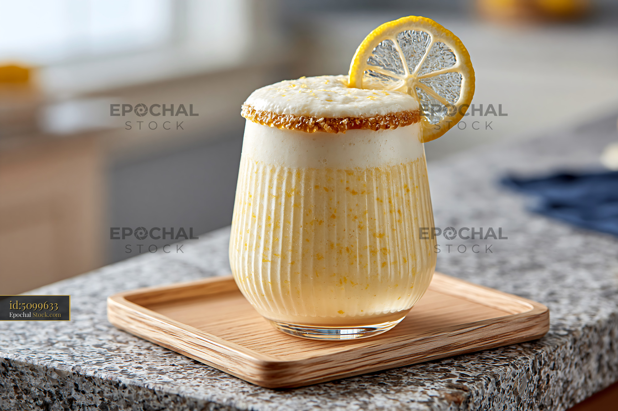Yuzu honey smoothie with creamy foam and lemon slice in a kitchen