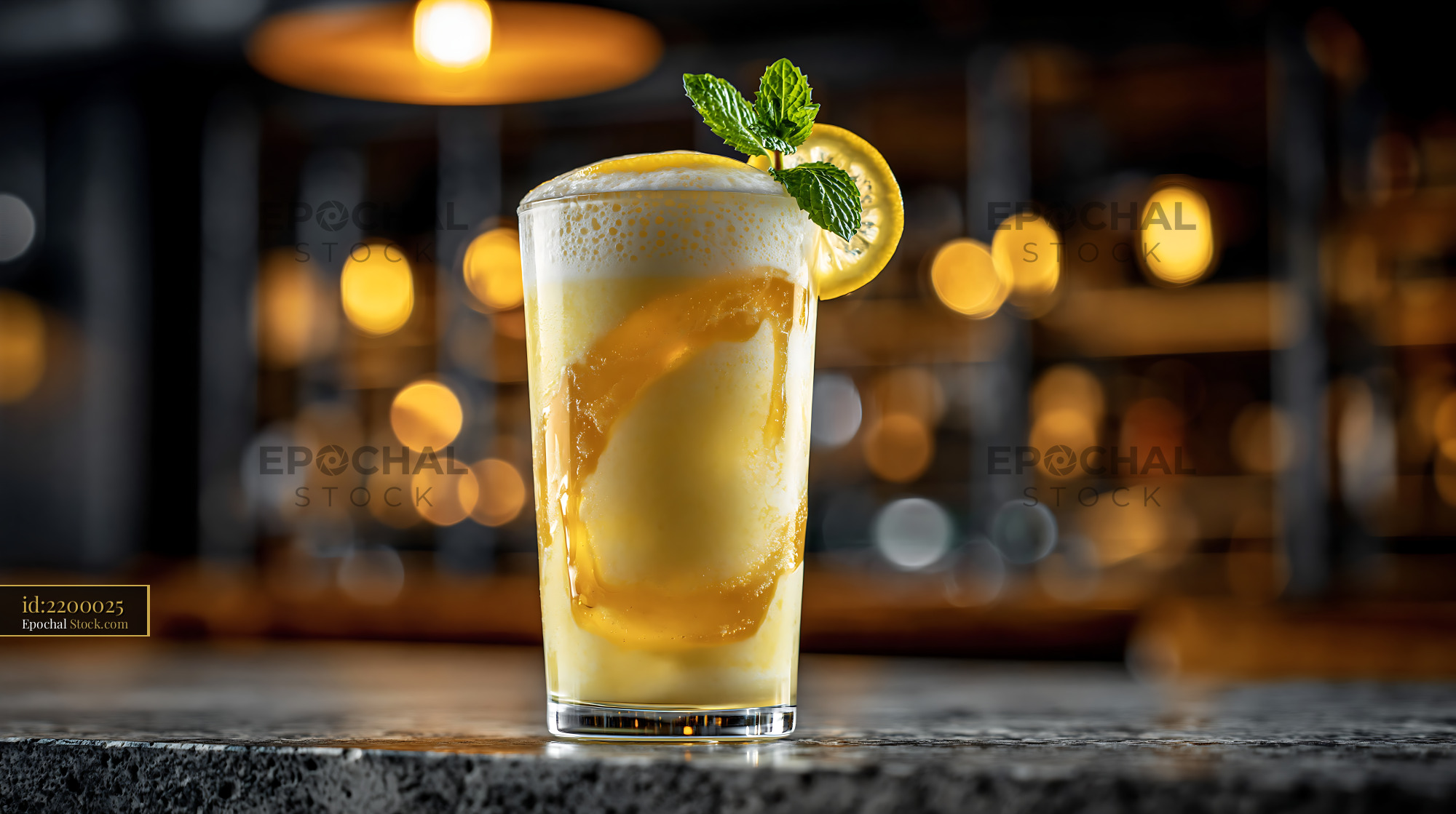 Yuzu honey smoothie with fresh mint and lemon in a bar setting